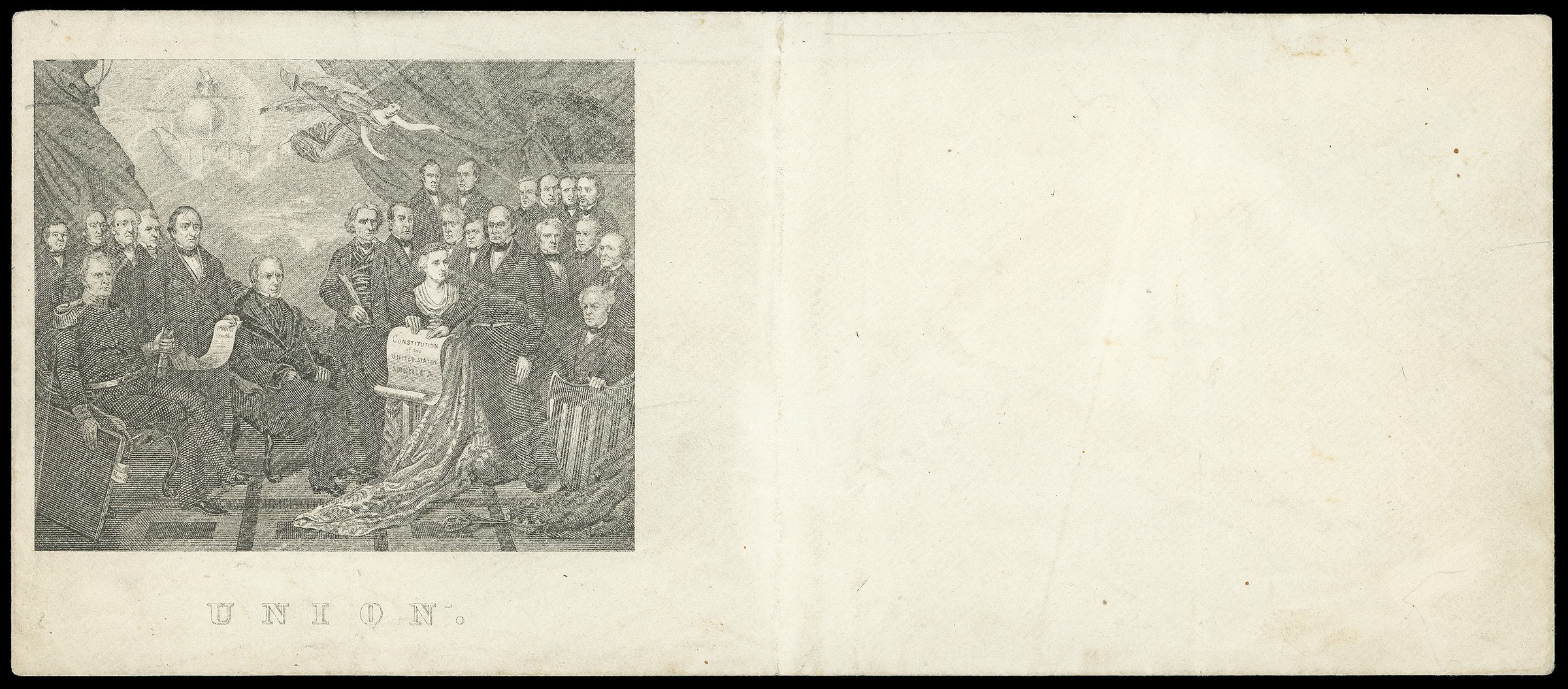 81     WS-5 image(1852 Campaign) "Compromise of 1852". Unused legal-size cover with patriotic design at left and "Union" below showing reproduction of 1852 painting by Harrison Matteson of Gen. Scott seated at left and surrounded by politicians; vertical folds, otherwise Very Fine and scarce.