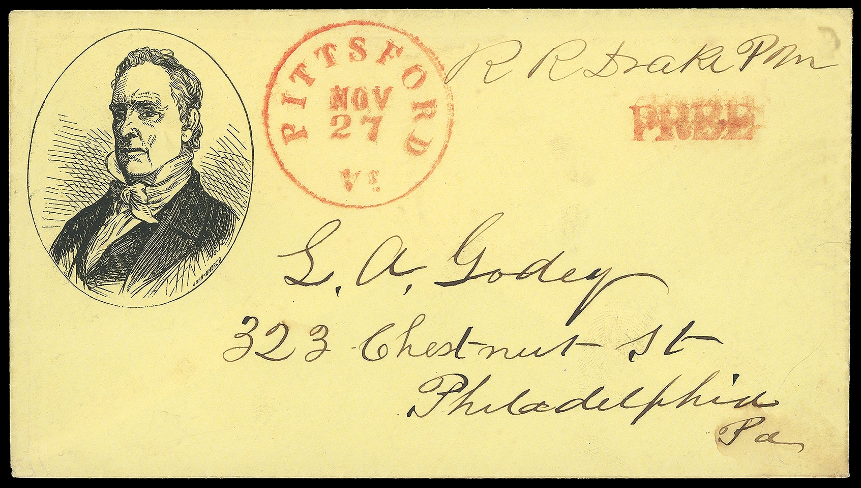84     JB-1 image(1856 Campaign) James Buchanan. Oval portrait campaign design with "John Andrew" imprint on fresh yellow cover with red "Pittsford Vt. Nov 27" cds and matching "Free" rating straightline with postmaster "R.R. Drake PM" free frank to Philadelphia Pa., Extremely Fine and choice.