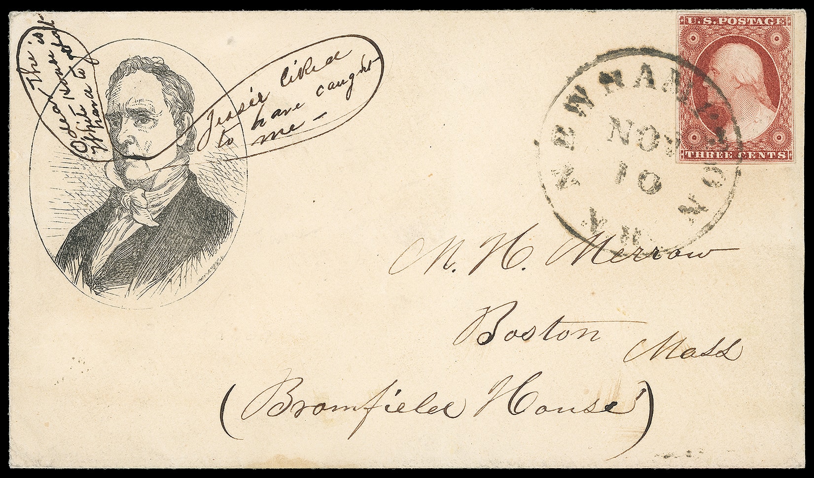85     JB-1 image(1856 Campaign) James Buchanan. Oval portrait campaign design with "John Andrew" imprint, additional manuscript balloon verse "Oh dear the White House is hard to get at" and "Jessie liked to have caught me" on light buff cover bearing 3¢ dull red (11A), four even margins, tied by "New Hamilton N.H. Nov 10" cds to Boston Mass., Extremely Fine.