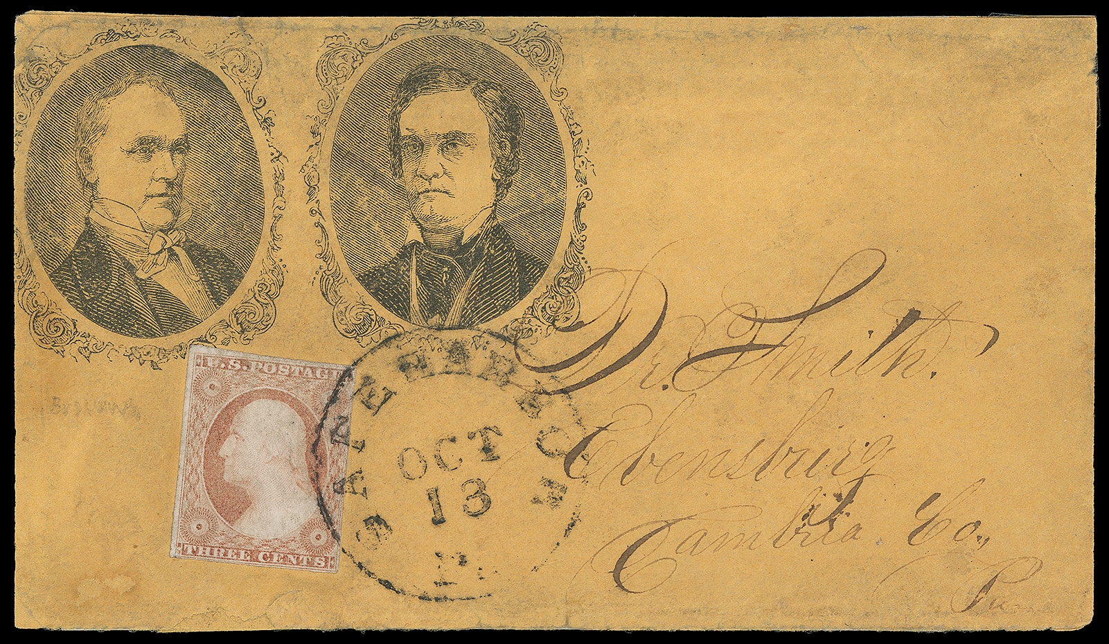 88     JB-9 image(1856 Campaign) James Buchanan, John Breckinridge. Campaign design with dual portraits in ornate ovals on orange cover bearing 3¢ dull red (11A), clear to large margins, tied by "Safe Harbor, Pa. Oct 13" cds to Ebensburg Pa.; light soiling and wear, small edge repair bottom left, F.-V.F. appearance.
