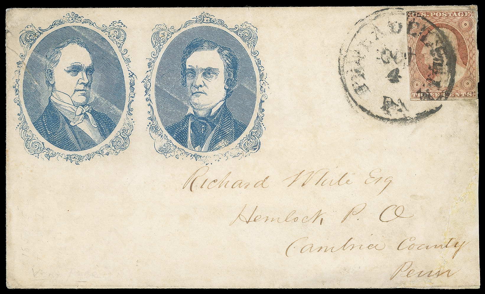 89     JB-9 var. image(1856 Campaign) James Buchanan, John Breckinridge. Blue campaign design with dual portraits in ornate frames on cover bearing 3¢ dull red (11A), small tear, tied by "Philadelphia, Pa. Oct 4" cds to Hemlock Pa.; left edge tear, reduced and repaired right edge, Very Fine appearance, the only recorded example of this portrait design in blue.