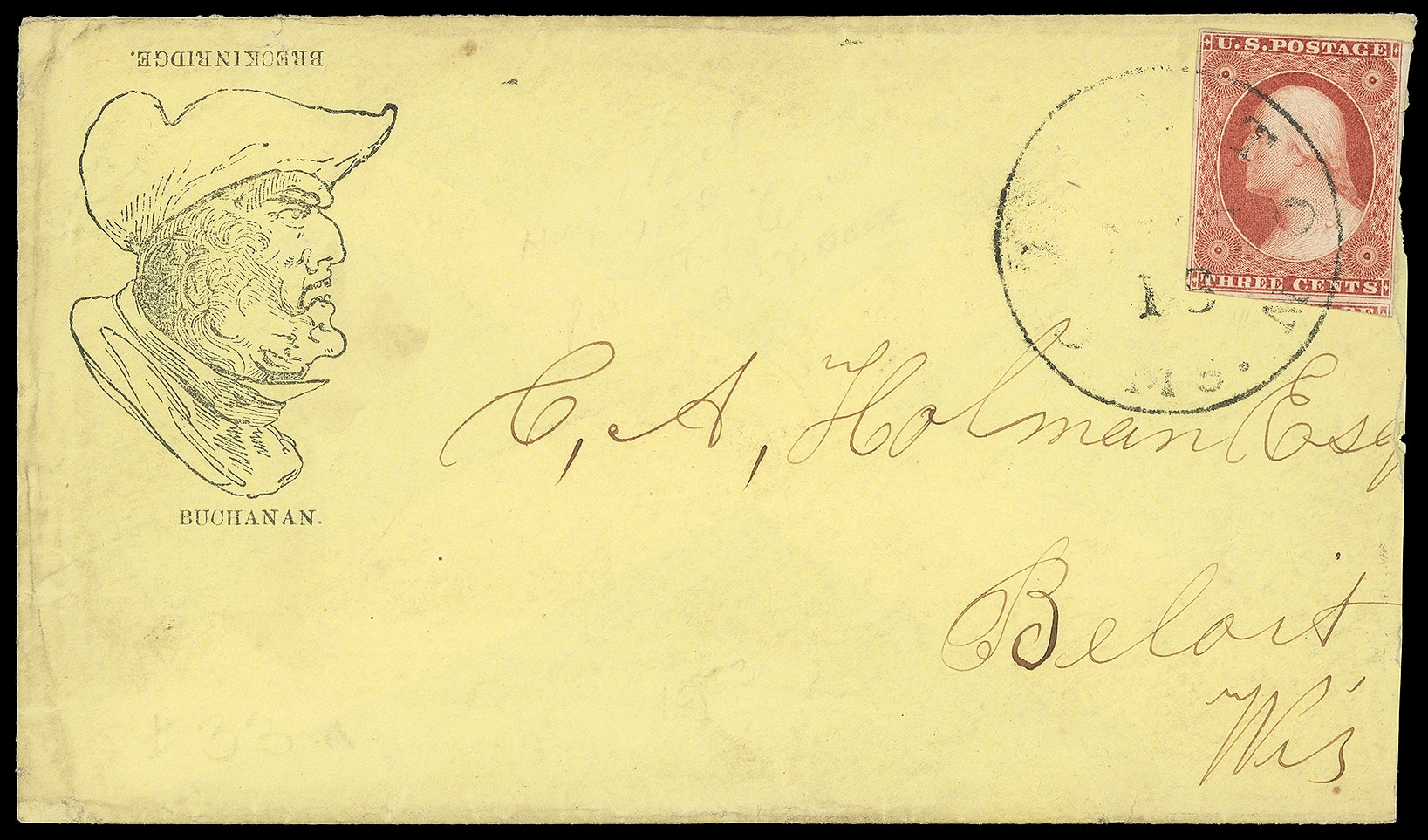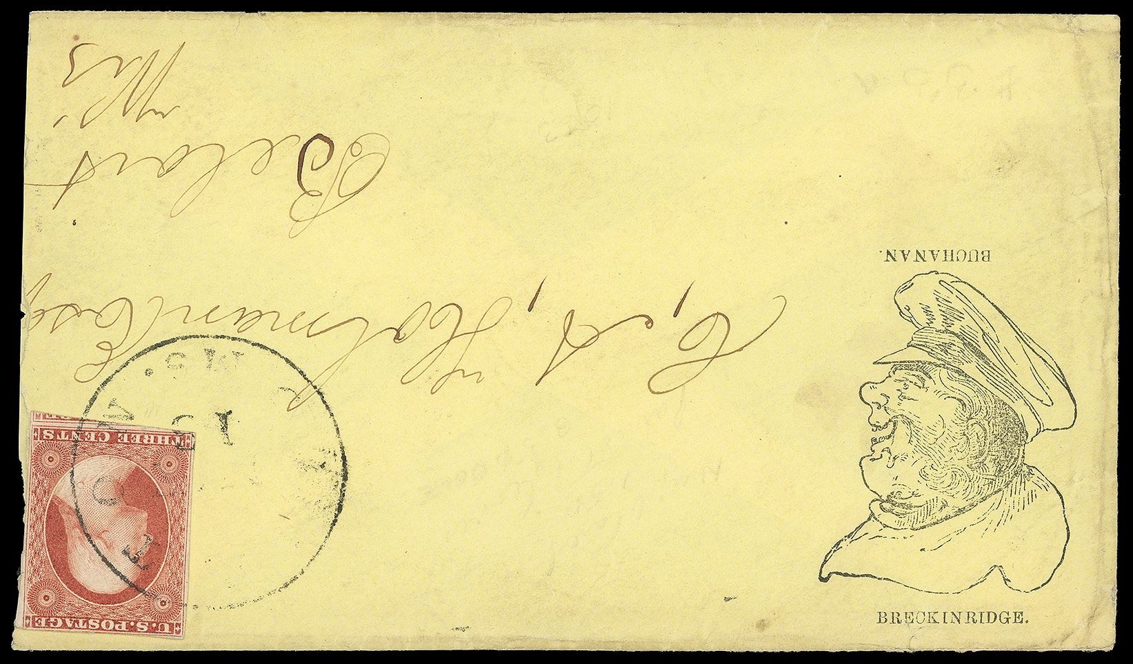 92     JB-15 image(1856 Campaign) James Buchanan, John Breckinridge. Caricature campaign design showing an angry Buchanan and turned upside down shows a smiling Breckenridge on yellow cover bearing 3¢ dull red (11), large margins to touched, tied by indistinct "Clinton Ms. May 15" cds to Beloit, Wisc.; reduced at right, F.-V.F. and unusual campaign design.