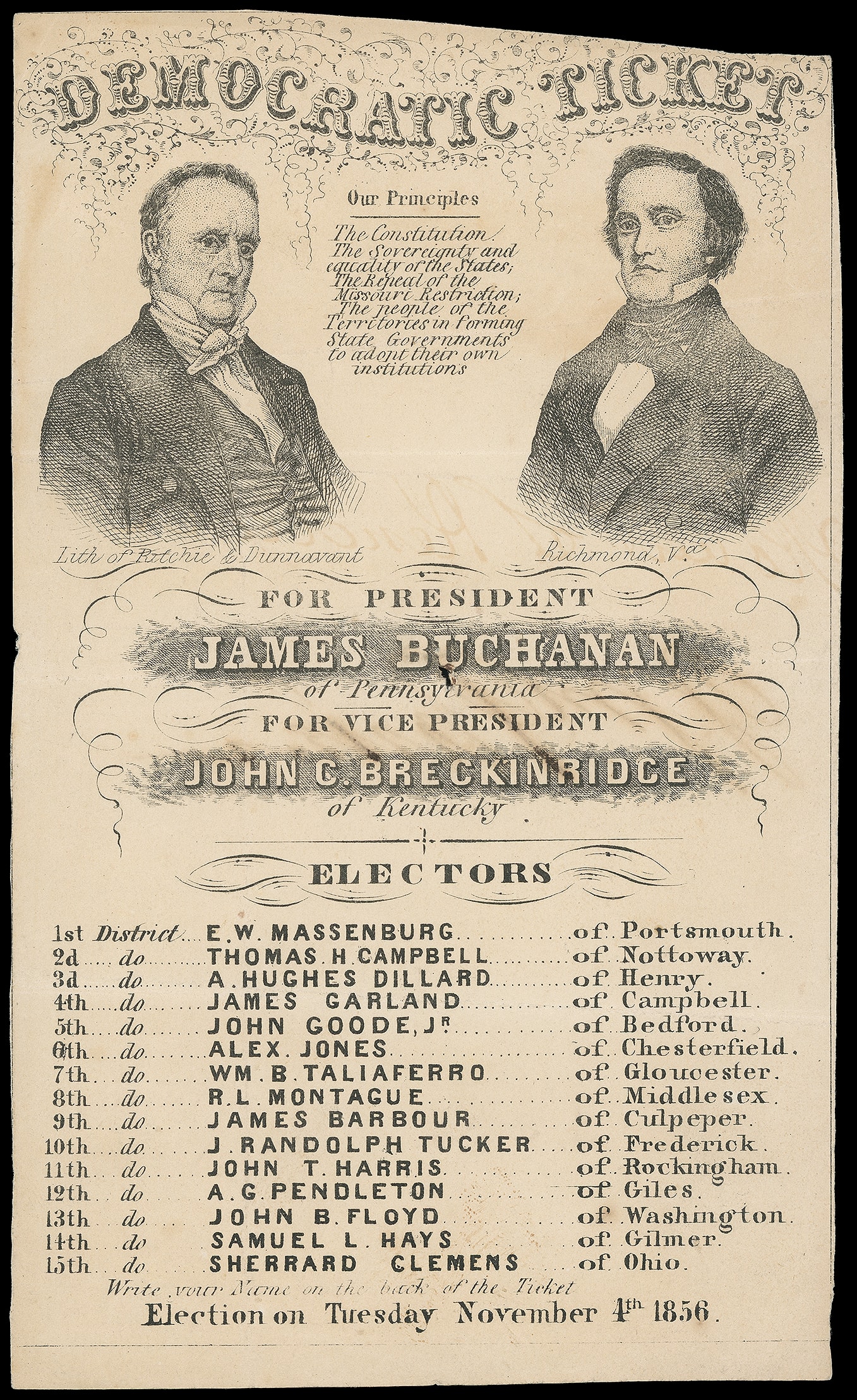 93     JB-unlisted image(1856 Campaign) James Buchanan, John Breckinridge "Democratic Ticket". Ornate broadside type ticket with portraits at top and list of Electors below, additional small "Democratic-Ticket" with list of Presidential Electors, Very Fine.