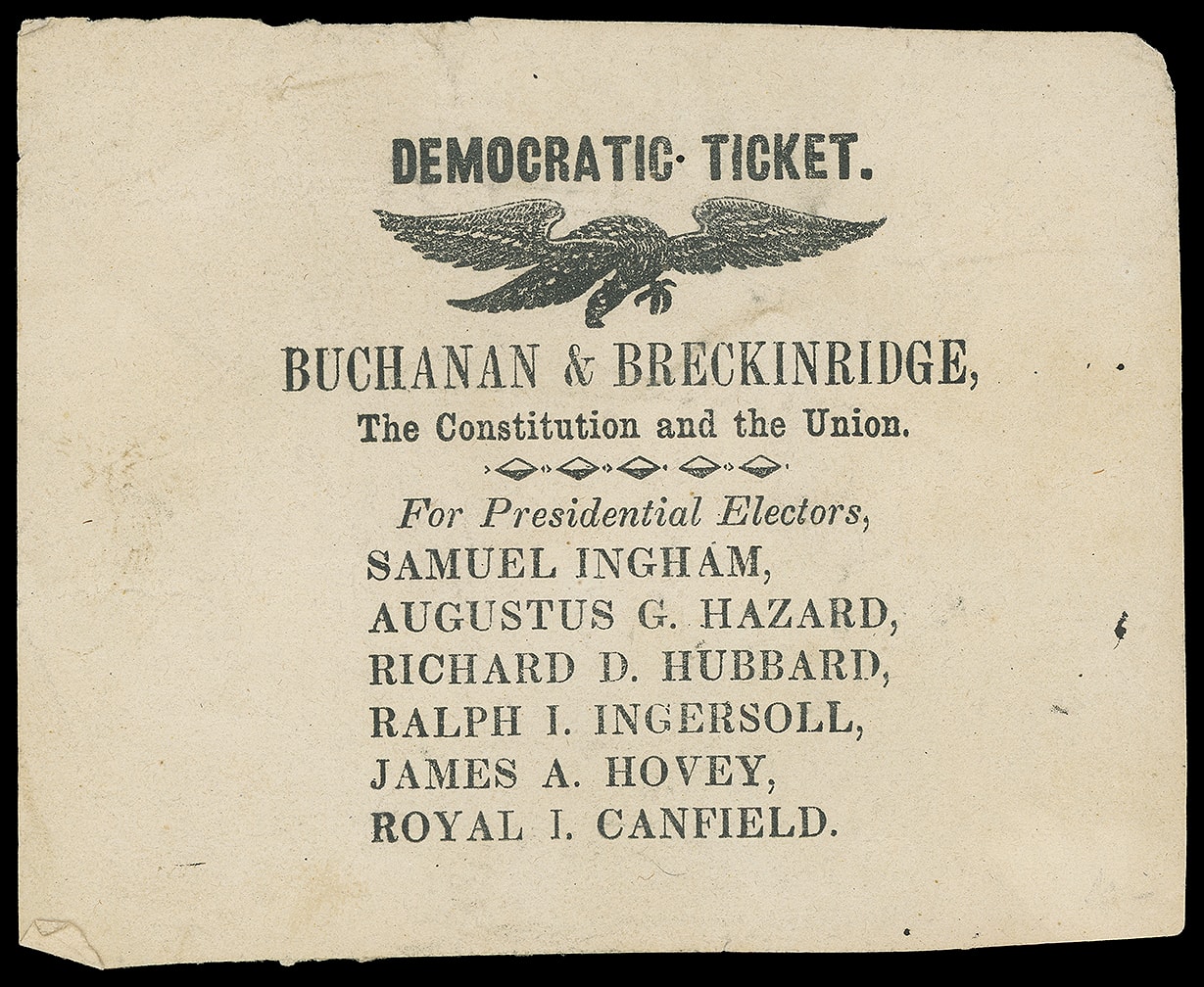 This patriotic campaign design was used again for the 1860 campaign with the names "Buchanan & Breckinridge" removed.