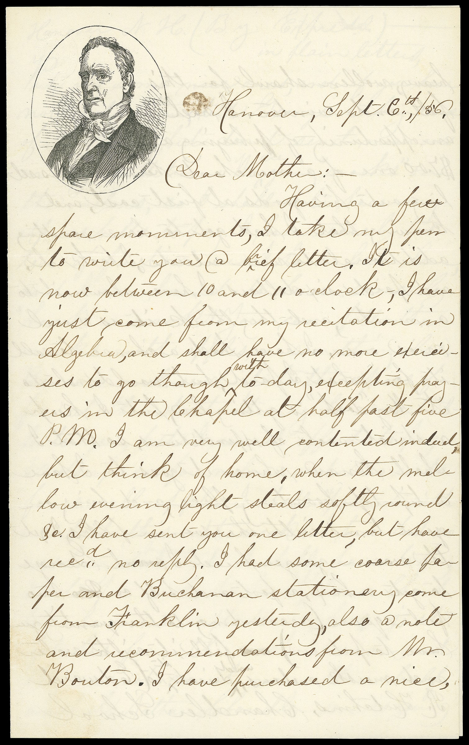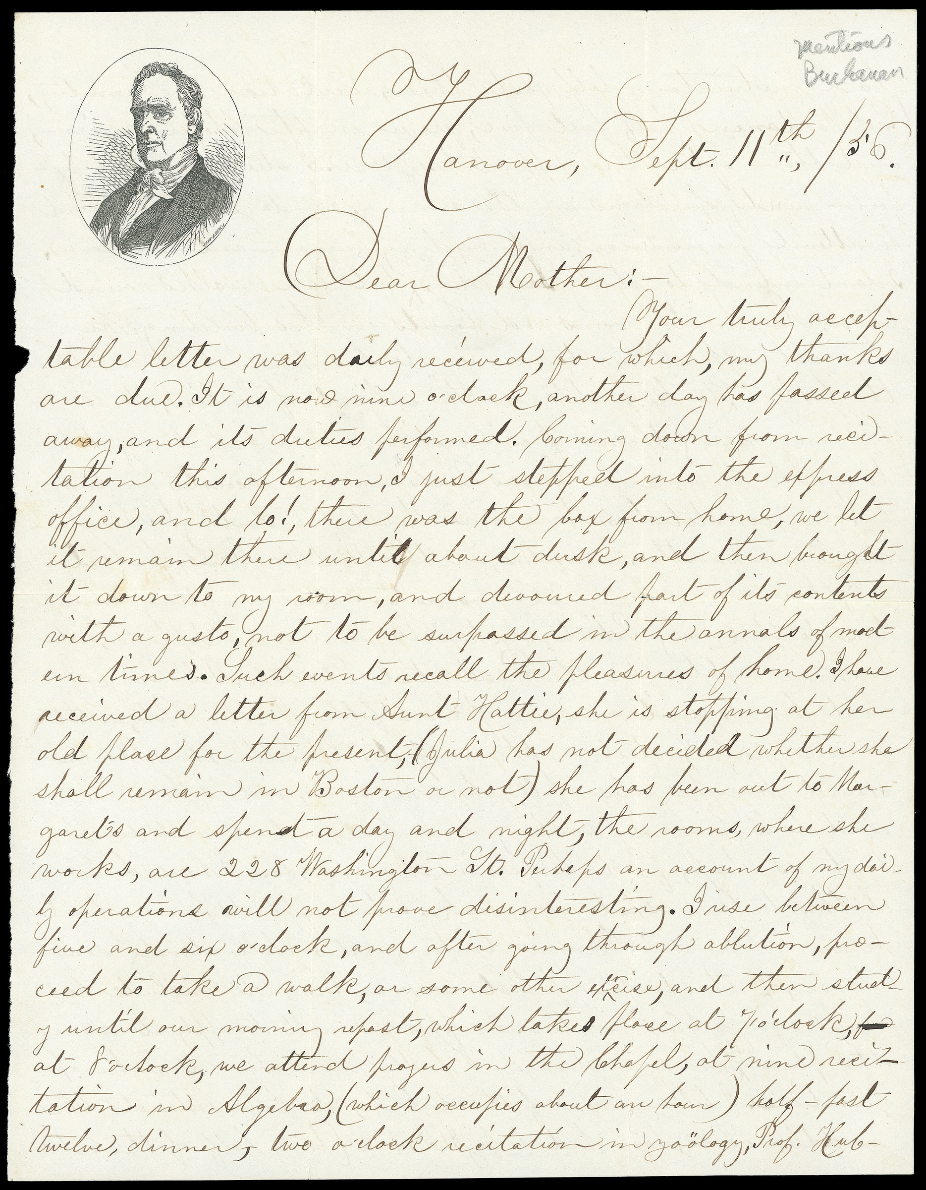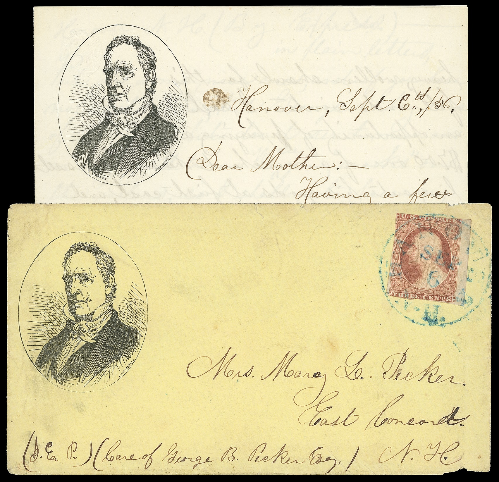86     JB-1 image(1856 Campaign) James Buchanan. Oval portrait campaign design with "John Andrew" imprint on 1856 yellow cover bearing 3¢ dull red (11) right margin single, margins to in, tied by blue "Hanover N.H. Sep 6" cds to East Concord N.H., with matching campaign portrait lettersheet datelined "Hanover, Sept 6th /56", accompanied by second campaign portrait lettersheet dated Sept. 11th 1856 on larger leaf; cover edge flaws and wear, F.-V.F.