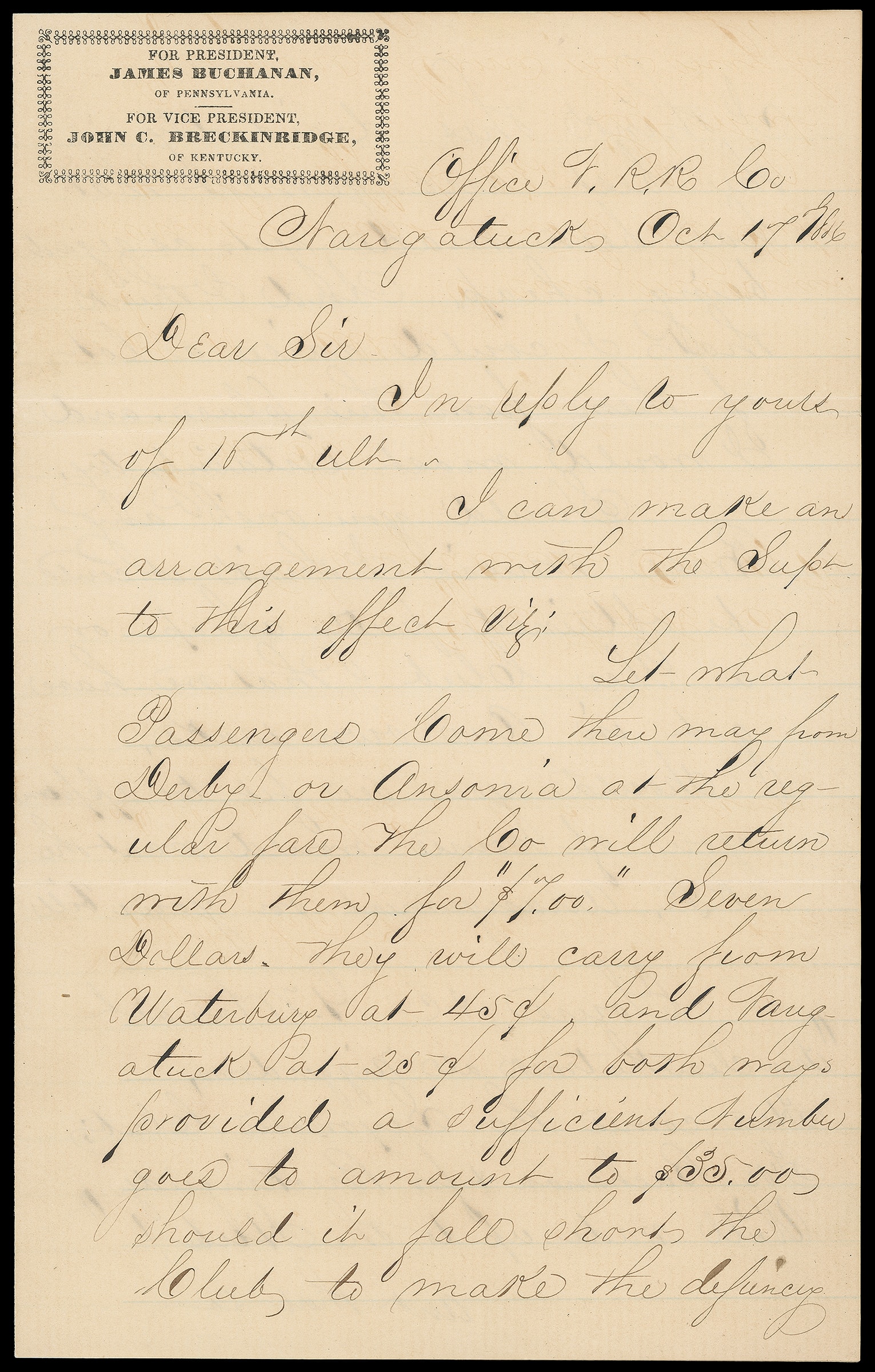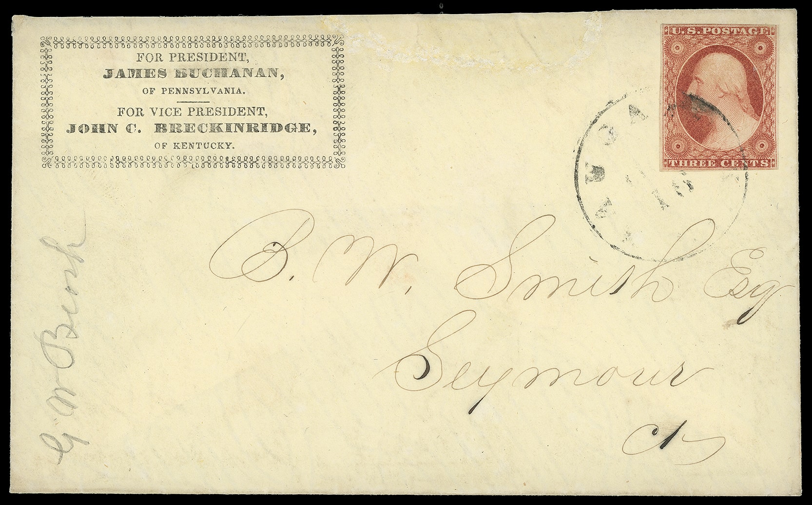 91     JB-14 image(1856 Campaign) James Buchanan, John Breckinridge. Ornate campaign design corner card on cover bearing 3¢ dull red (11), rich color, margins to touched, tied by indistinct "Naugatuck Ct. Oct 16" cds to Seymour Ct., with original matching letterhead enclosure datelined "Oct 17th 1856" that mentions discount railroad tickets to a Buchanan rally; cover opening tear mend at top, no flap, Very Fine appearance, the only recorded example.