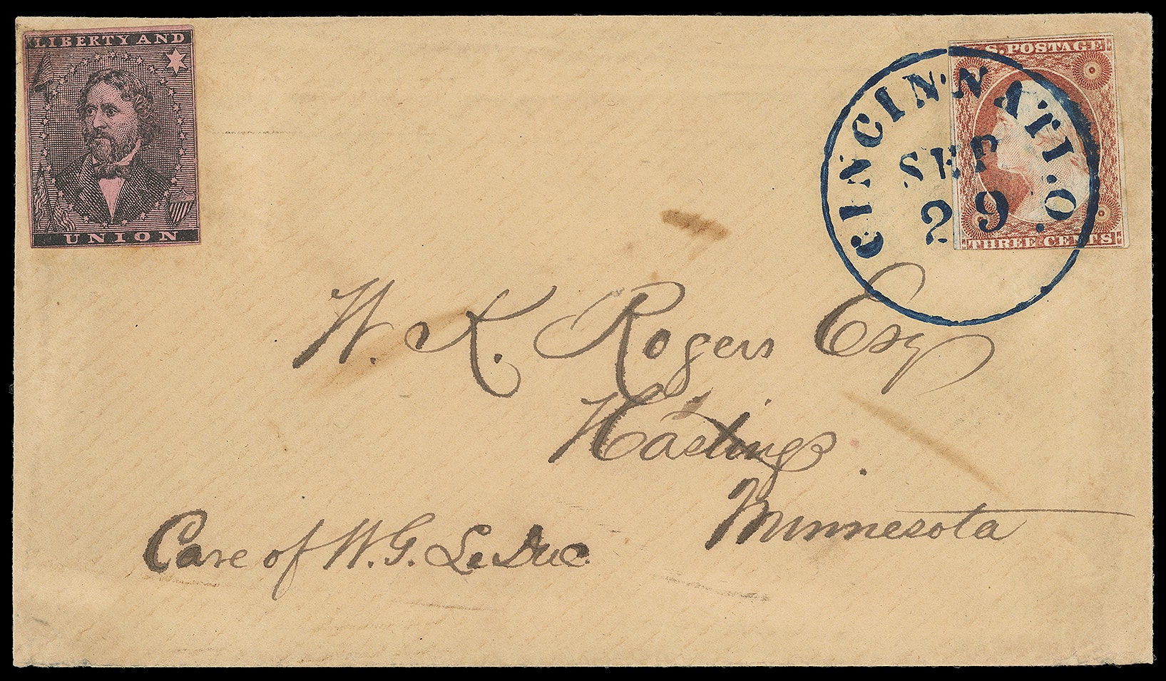 94     JF-1 image(1856 Campaign) John Fremont. Black on pink "Liberty and Union" campaign label on buff cover bearing 3¢ dull red (11), margins to slightly in, tied by bold blue "Cincinnati O. Sep 29" cds to Hastings Minn.; couple light stains, Very Fine and choice Fremont Campaign label use.