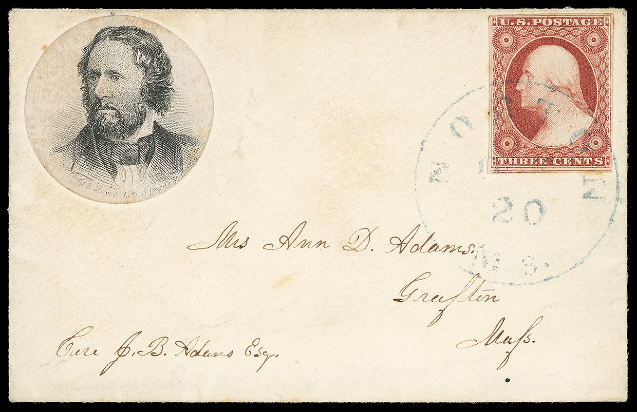 95     JF-2 image(1856 Campaign) John Fremont. Circular portrait campaign label with "Prang & Mayher" imprint, affixed on ladies cover bearing 3¢ dull red (11) tied by light blue "Norton Ms. Oct 20" cds to Grafton, Mass., Very Fine and rare Fremont campaign label.