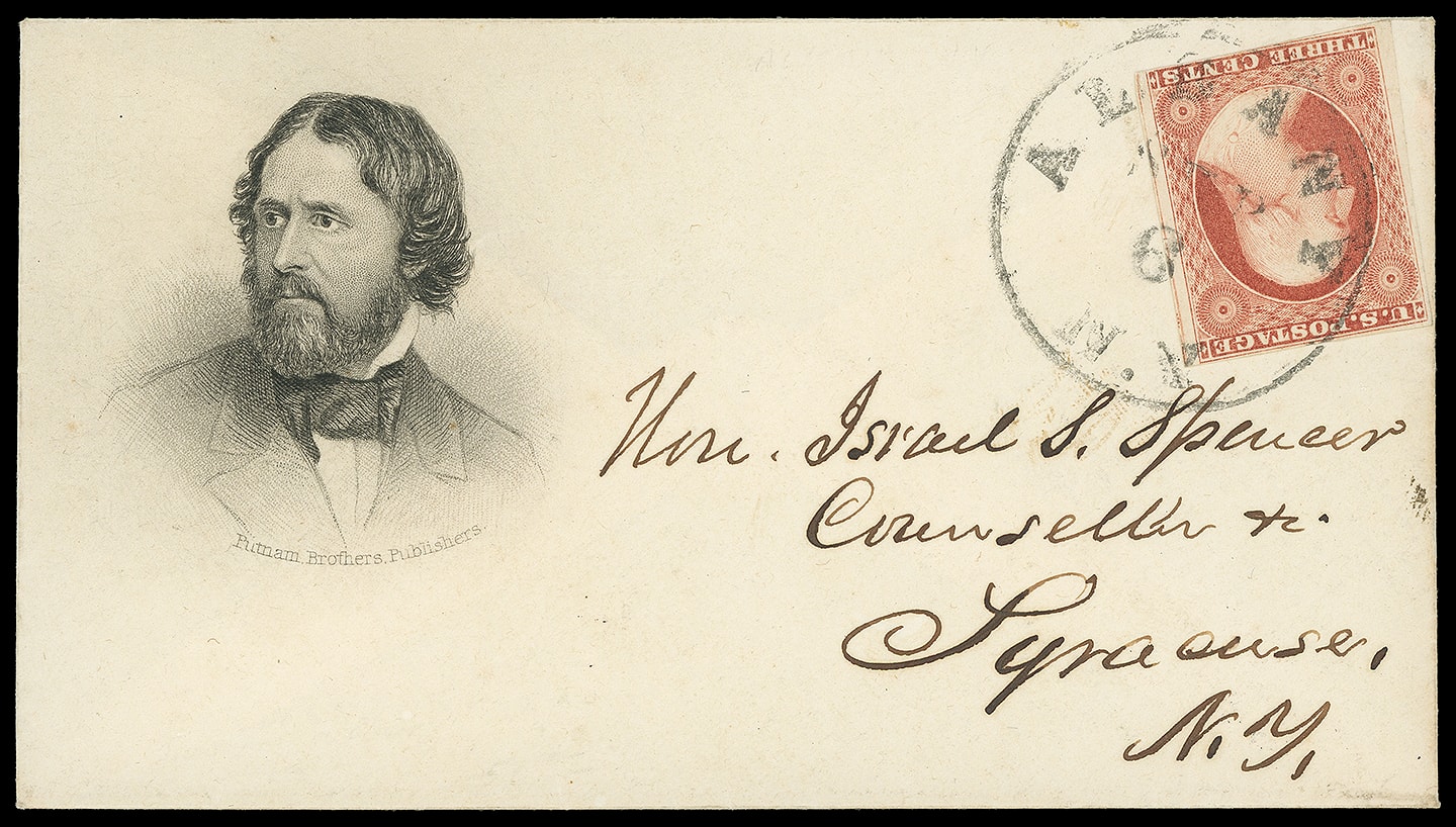97     JF-4 image(1856 Campaign) John Fremont. Portrait campaign design with Putnam Brothers Publishers imprint below on small cover bearing 3¢ dull red (11), large margins to slightly in, tied by "Albany N.Y. Sep 6" cds to Syracuse N.Y., fresh and Extremely Fine, ex-Downing.