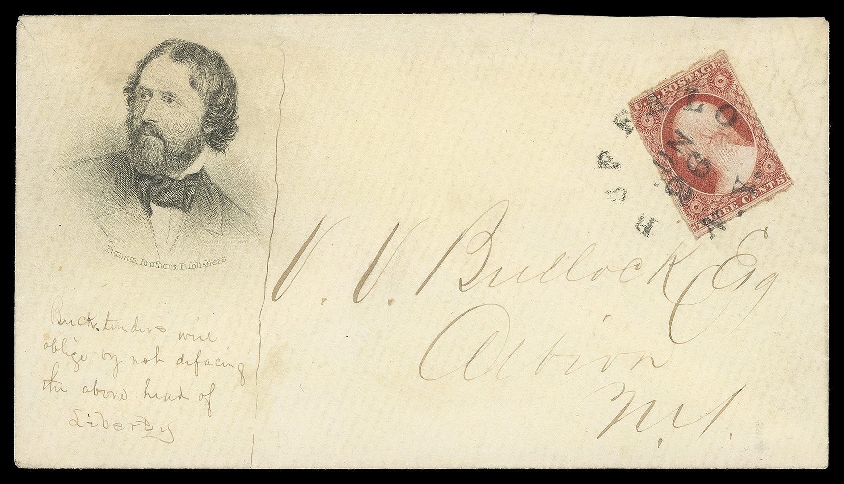 98     JF-4 image(1856 Campaign) John Fremont. Portrait campaign design with "Putnam Brothers Publishers" imprint below, additional manuscript patriotic embellishment below "Bucktenders will oblige by not defacing the above head of Liberty" on cover bearing 3¢ dull red (11) tied by rimless "Buffalo N.Y. Jun 26" cds to Albion N.Y.; couple tiny edge tears, Very Fine.