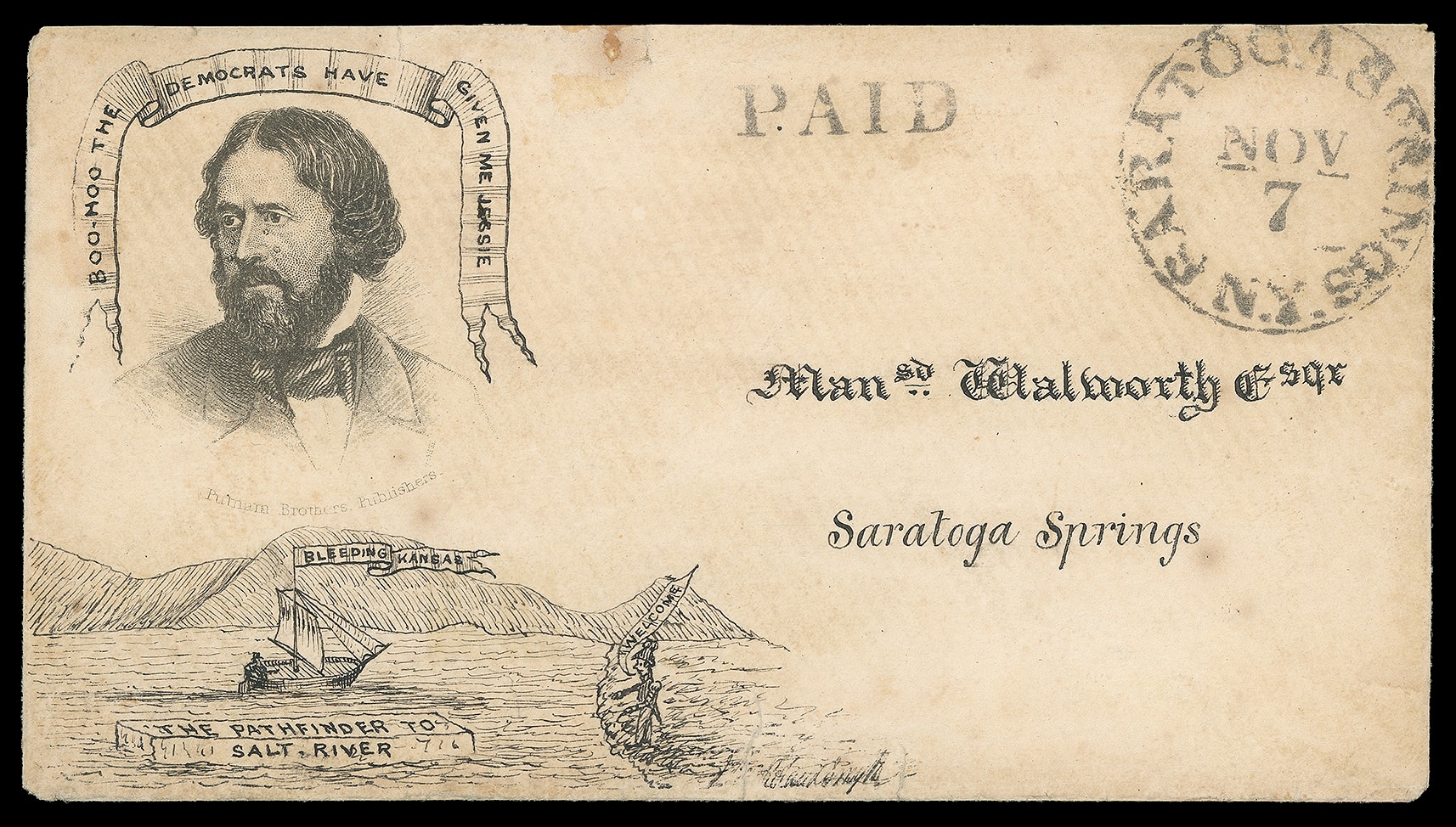 99     JF-4 image(1856 Campaign) John Fremont. Portrait campaign design with "Putnam Brothers Printers" imprint below, additional hand drawing in ink by artist John Roland Smyth depicting illustrations and anti-Fremont sentiments "The Pathfinder to Salt River", "Bleeding Kansas", image of Gen. Scott bidding him "Welcome" banner, above portrait "BOO HOO the Democrats have given me Jessie" on cover with "Saratoga Springs, N.Y. Nov 7" cds and "Paid" straightline sent locally to Saratoga Springs N.Y.; small reinforced top edge flaws, partial flap, F.-V.F. and impressive hand-drawn campaign design.