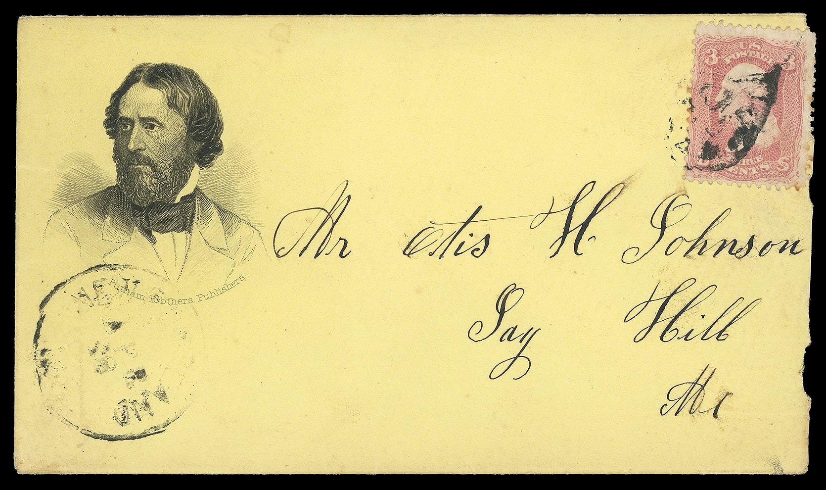 96     JF-3 image(1856 Campaign) John Fremont. Portrait campaign design with "Putnam Brothers Publishers" imprint below on yellow cover bearing 3¢ rose (65) tied by circular cancel, matching indistinct "New Portland Me. Apr 28" cds to Jay Hill Me.; reduced slightly irregular at right, otherwise Very Fine.