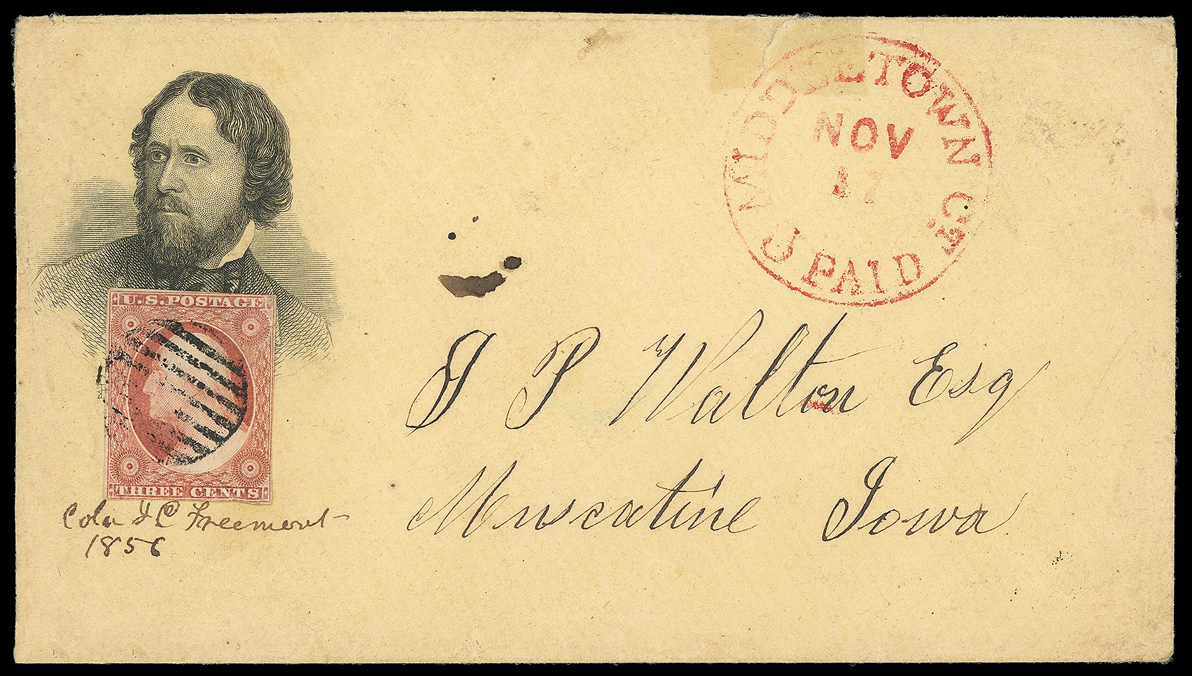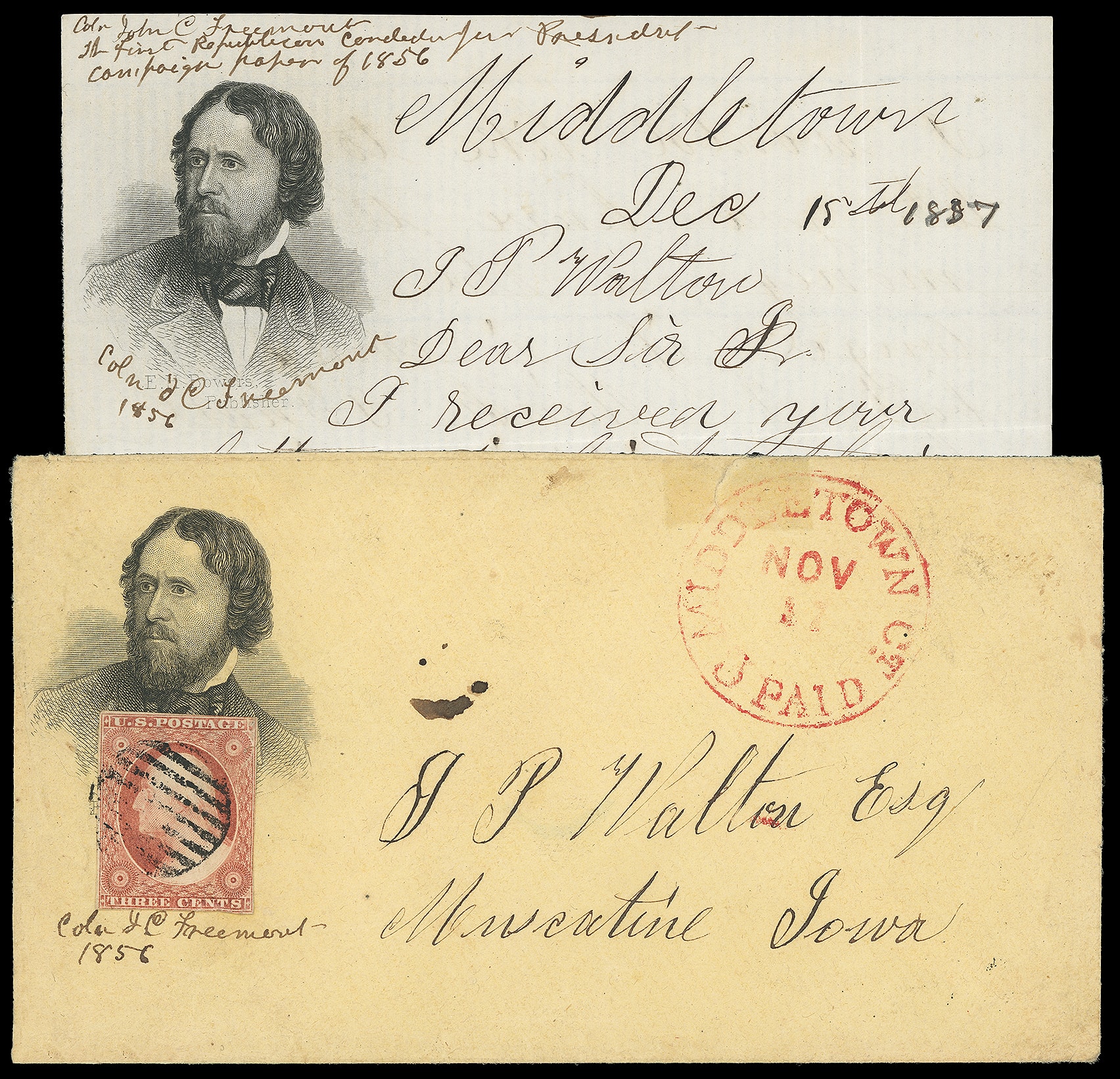 100     JF-5 image(1856 Campaign) John Fremont. Engraved portrait campaign design on orange cover bearing 3¢ dull red (11A) tied by grid, red "Middletown Ct, Paid, Nov 11" cds to Muscatine Iowa, with original matching portrait campaign lettersheet with additional manuscript notations surrounding and "Coln J.C. Fremont 1856" caption; lettersheet with some paper loss, 3¢ tiny flaw, F.-V.F. and scarce matching campaign stationery.