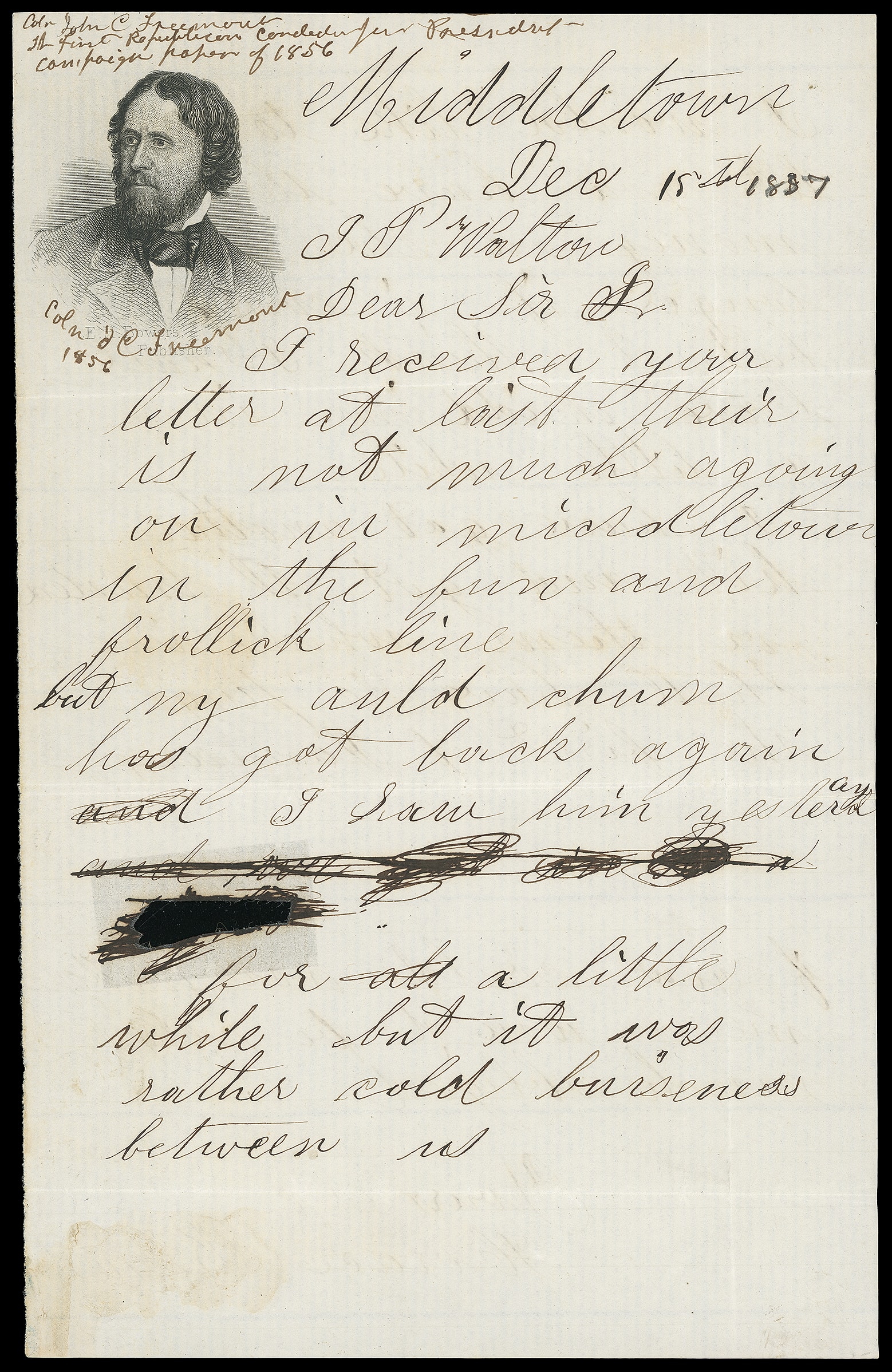 There is a transcript of the original letter that no longer accompanies: "November 7, 1856…I send you an envelope got up by the Republican party wwith the head of John C. Fremont engraved on it. I have altered it to suit their present and I hope future fortunes. You see the big tears coursing down John C's cheeks for his defeat. You also see him in his boat, the "bleeding Kansas," going up Salt River, and General Scott standing on the shore to bid him welcome…John Roland Smyth".
