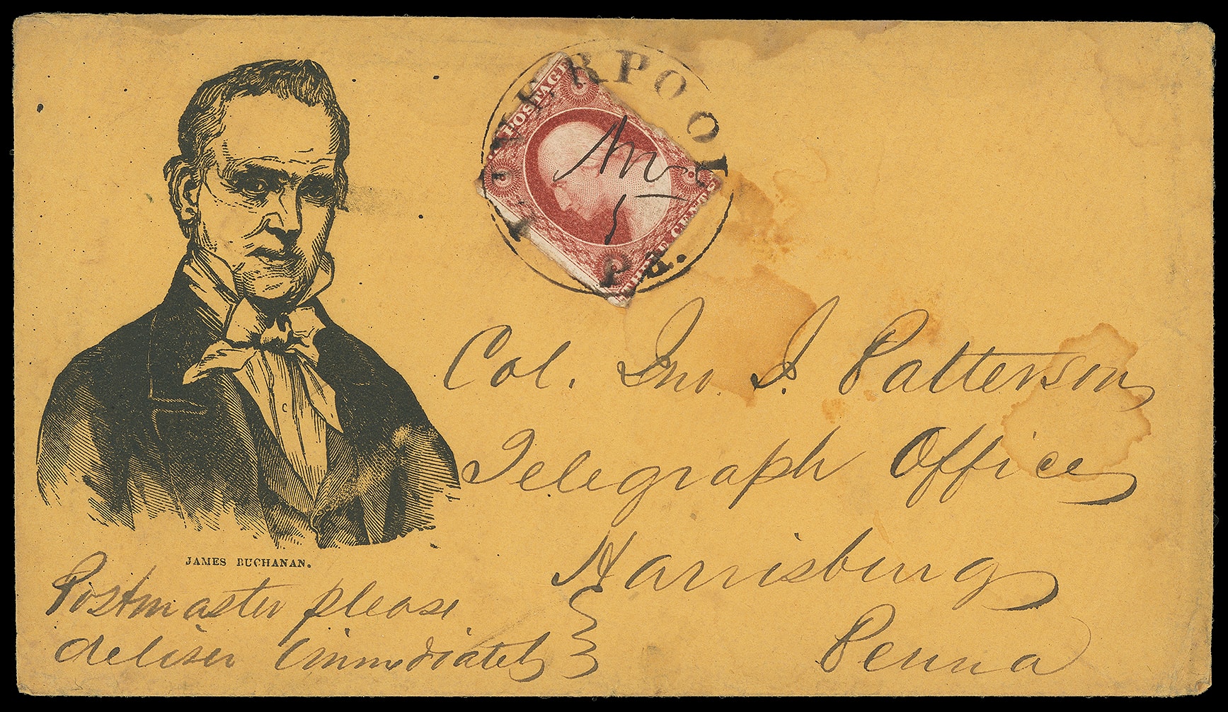 87     JB-4 image(1856 Campaign) James Buchanan. Large portrait campaign design on orange cover bearing 3¢ dull red (11) tied by "Liverpool, Pa. Nov 5" cds with ms. day to Harrisburg Pa.; light cover stains, 3¢ edge flaws, F.-V.F. and rare design.