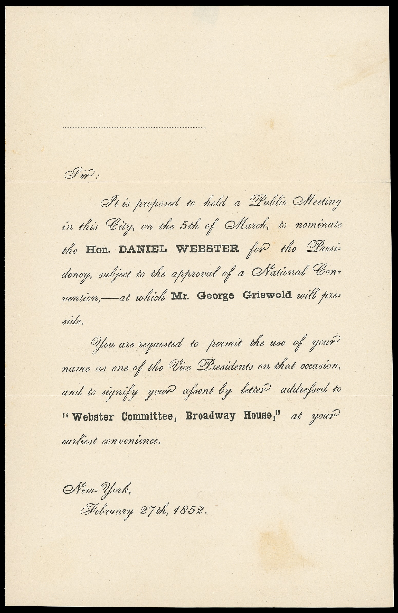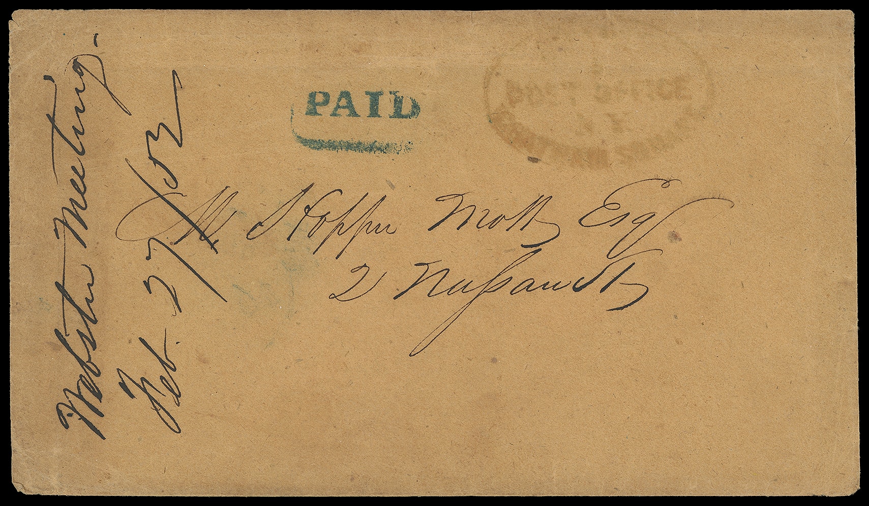 83       image(1852 Campaign) Daniel Webster. Printed "February 27th 1852" invitation to attend Webster Committee meeting to discuss the nomination process for Daniel Webster as President, regrets to "Webster Committee, Broadway House", accompanied by original orange buff cover bearing light red "Swarts Post Office N.Y. Chatham Square" oval and bold blue "Paid" straightline to local New York City street address, vertical "Webster Meeting Feb 27/52" docketing at left, attractive political postal history, F.-V.F.