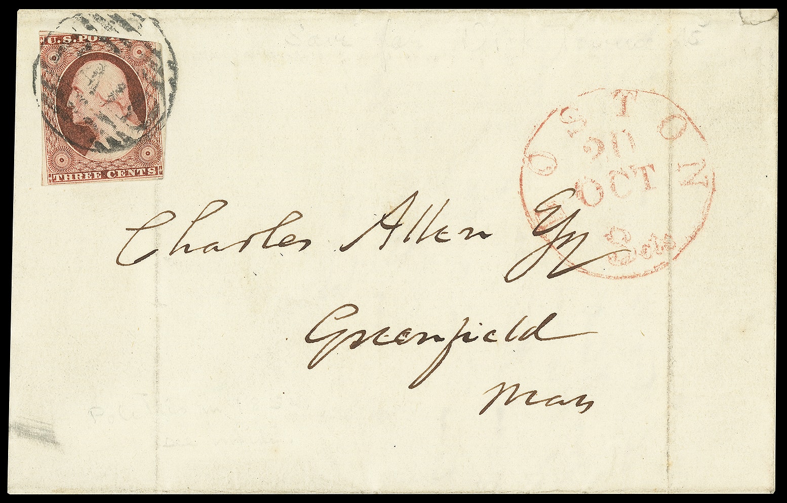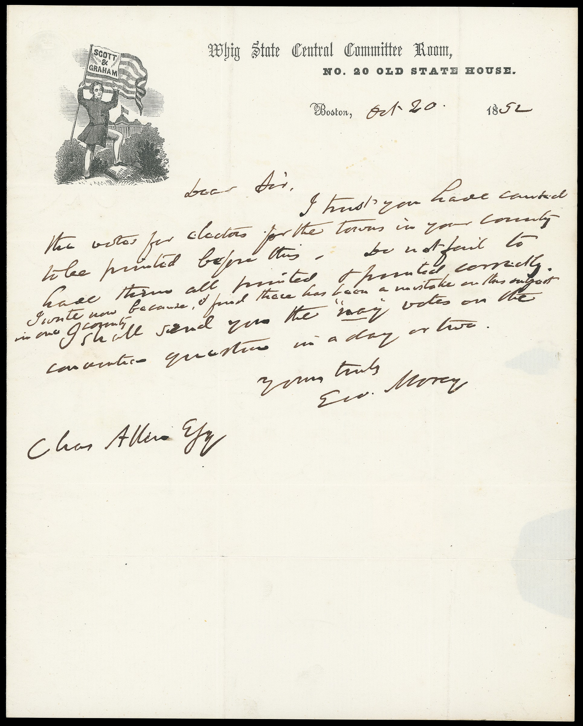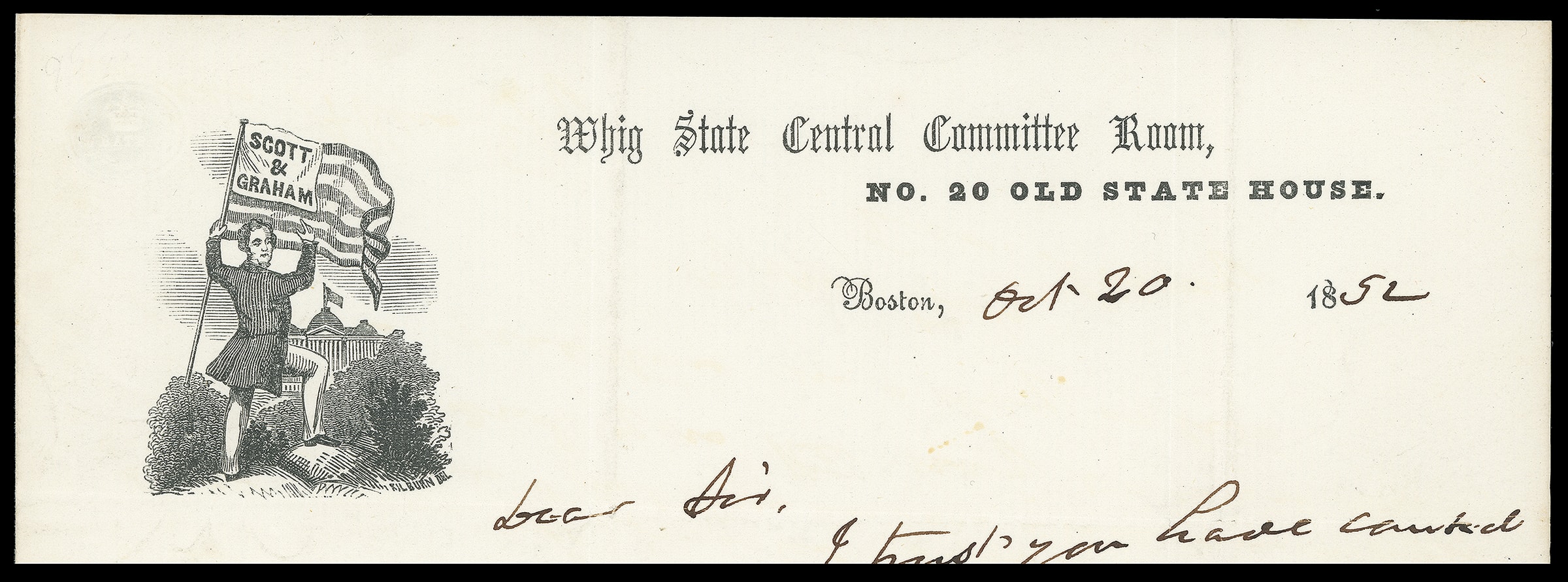 82     WS-6 image(1852 Campaign) Winfield Scott. Patriotic campaign design featuring Flag with "Scott & Graham" banner in front of Capitol, additional "Whig State Central Committee Room" imprint on lettersheet datelined "Boston, Oct 20. 1852" with political content "Dear Sir, I trust you have counted the votes for electors for the towns in your community to be printed before this…I shall send you the 'nay' votes on the convetion questions in a day or two…", entered mails with 3¢ dull red (11A), cut in, tied by large "Paid" grid, red "Boston '3cts' 20 Oct" cds to Greenfield Mass., Very Fine.