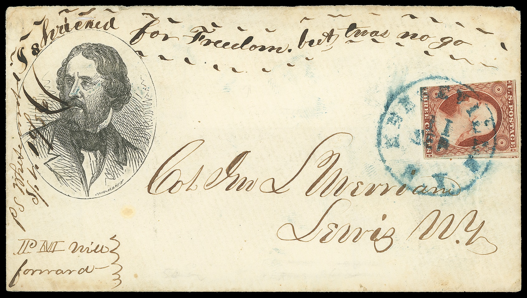 John Fremont. Oval portrait campaign design with manuscript "Shrieked for Freedom but twas no go" embellishment on cover bearing 3¢ dull red (11), three margins, tied by blue "Keeseville N.Y. 11 Feb" cds to Lewis N.Y.,
