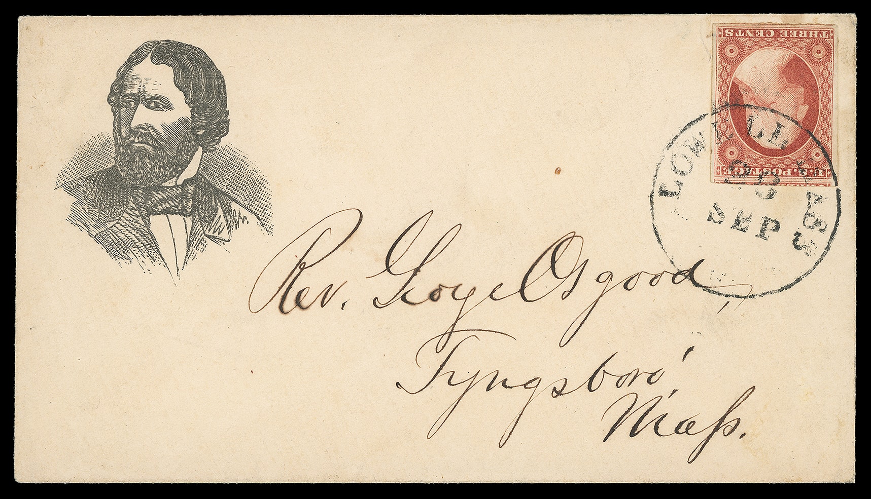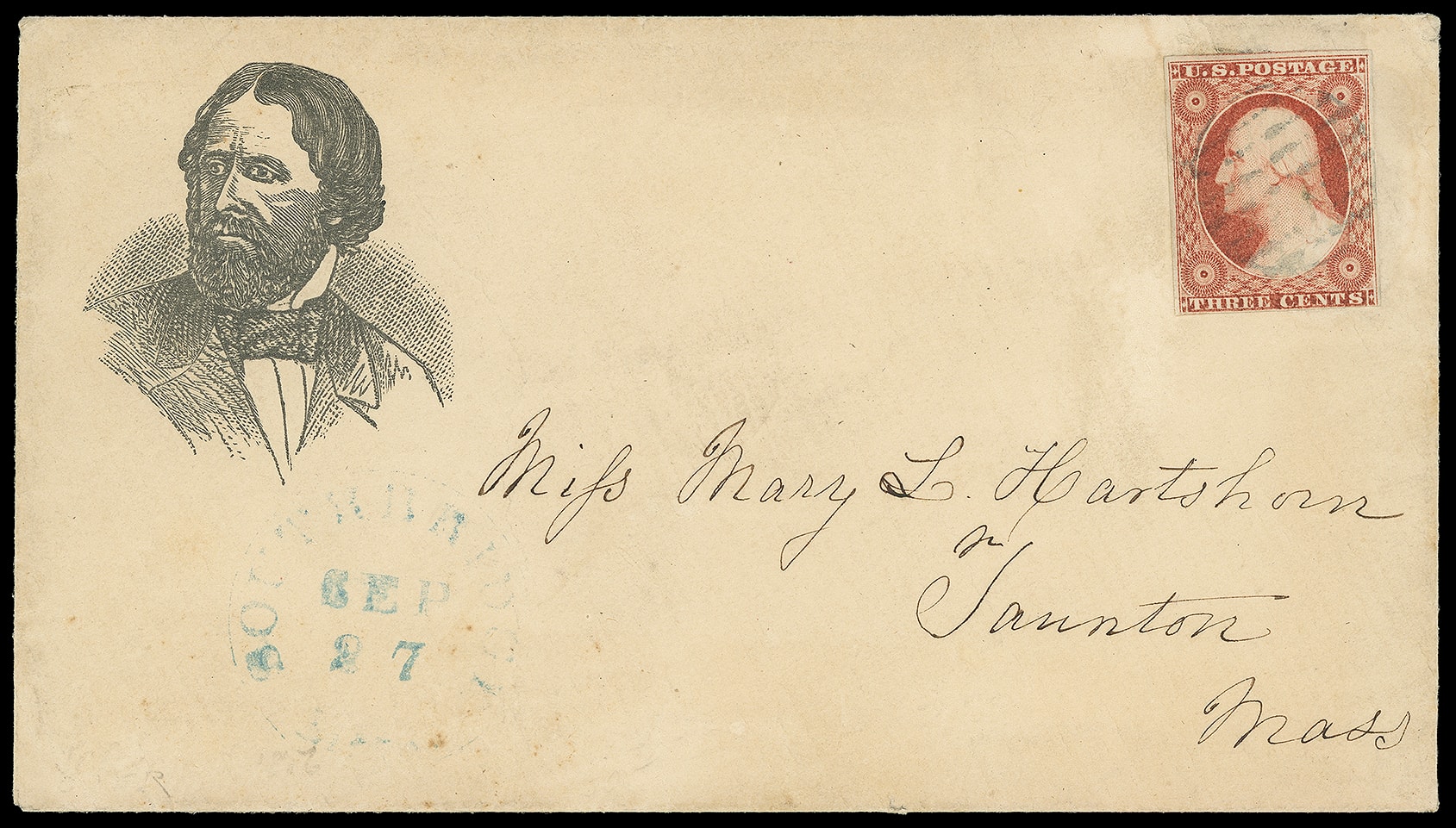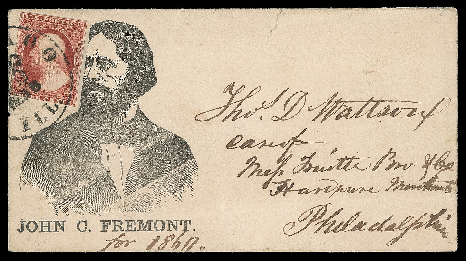 John Fremont. Cut-down portrait campaign design from JF-24 on buff cover bearing 3¢ dull red (11), irregular margins, tied by "Philadelphia Pa. Oct 9" cds to Bradford Mass., matching original letter with same cut-down portrait design