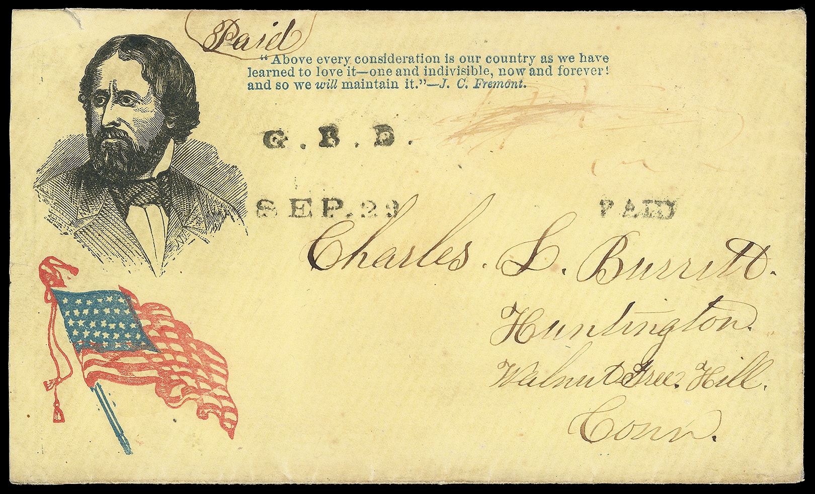 Civil War Patriotic) John Fremont. Portrait campaign design (JF-6) with additional patriotic designs of red and blue Flag and blue verse on yellow cover with "G.B.D. Sep 28" General Banks Division two-line postmark and matching small "Paid"