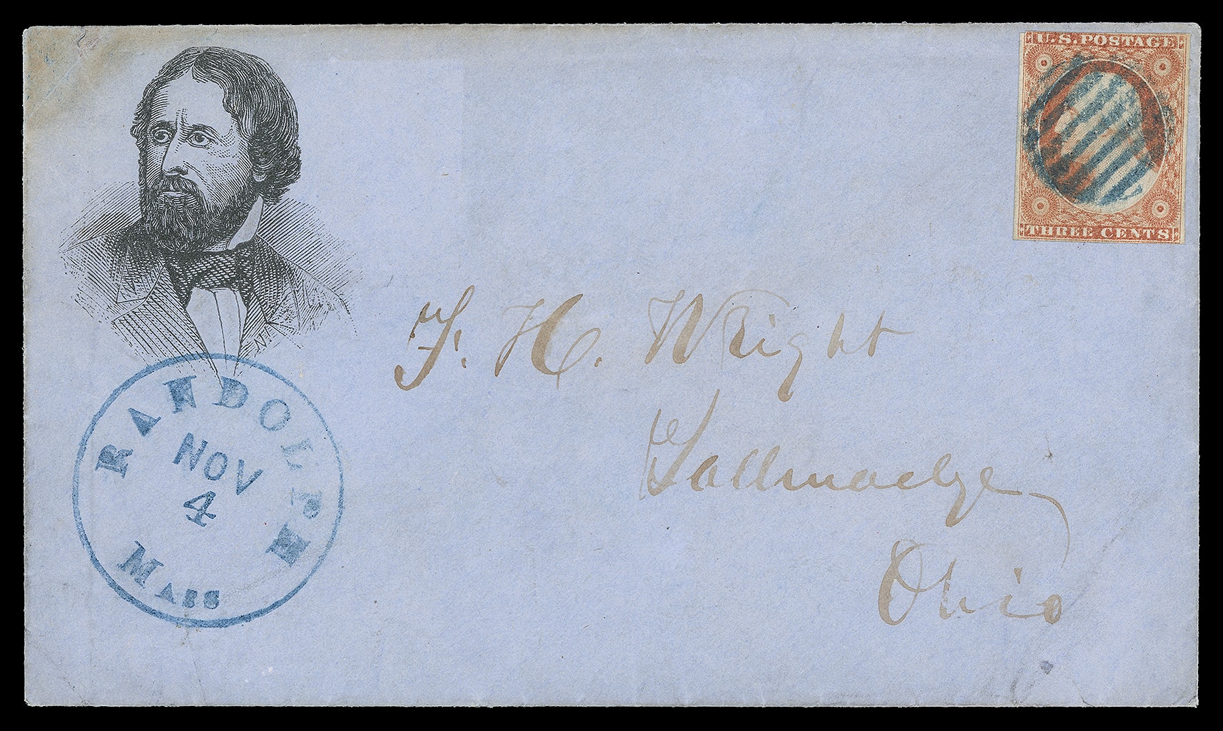 John Fremont. Portrait campaign design on blue cover bearing 3¢ dull red (11A) canceled by blue grid, matching blue "Randolph, Mass. Nov 4" cds to Ohio; some toning at top left, otherwise Very Fine and attractive, design