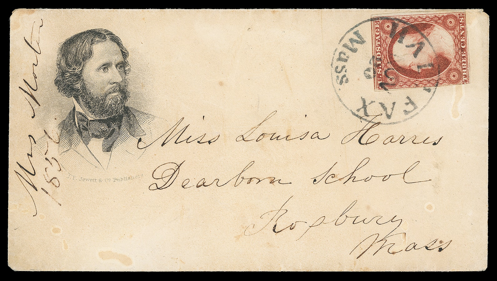 John Fremont. Portrait campaign design with J.P. Jewett & Co. Publishers imprint on buff cover bearing 3¢ dull red (11), rich color, tied by bold "Halifax Mass Nov 20" cds to Roxbury, Mass.; 1856 docketing at left, faint age spots,