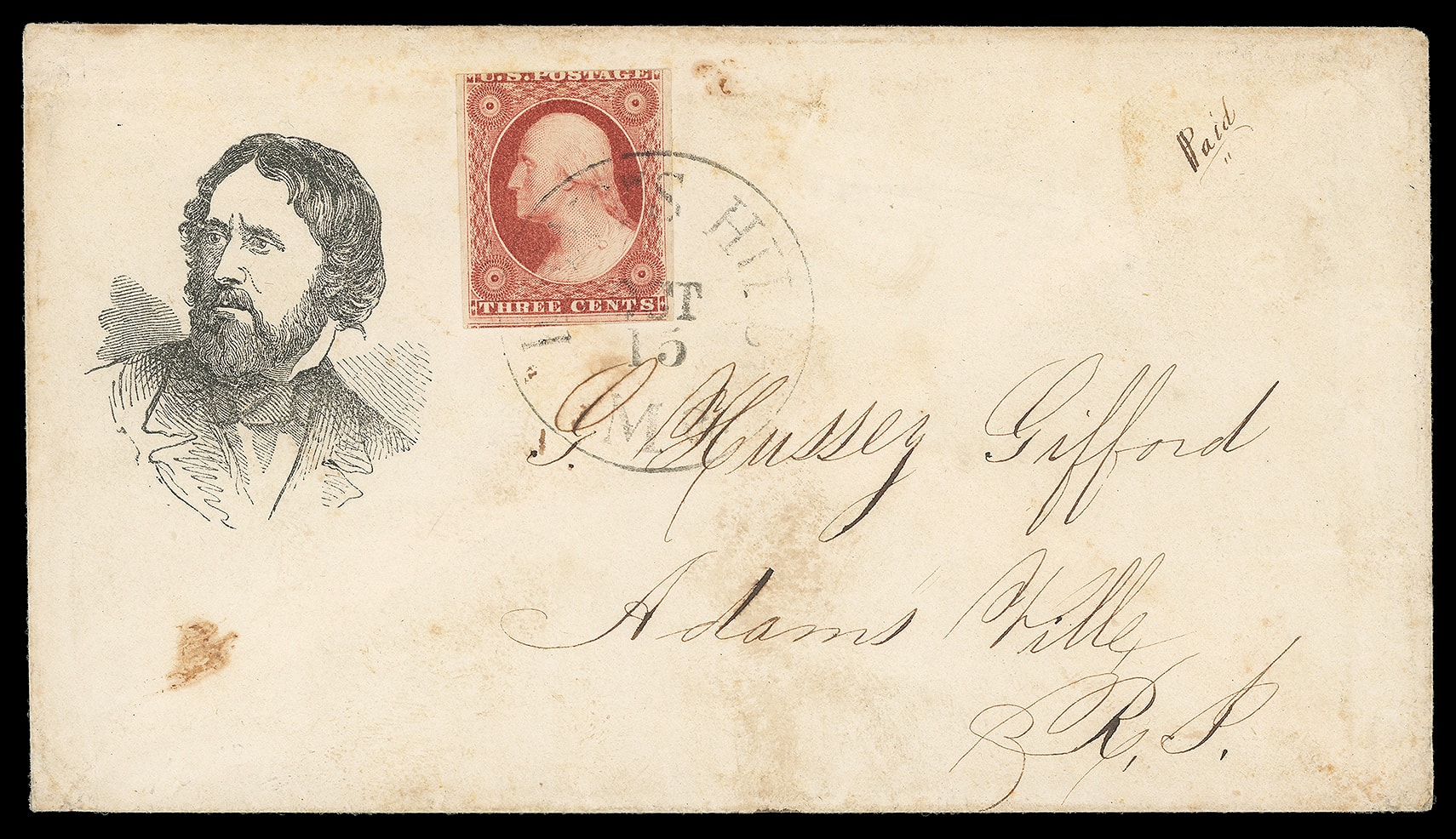 John Fremont. Portrait campaign design on cover bearing 3¢ dull red (11), three large margins, tied by indistinct "Hill, Me. Oct 15" cds to Adamsville R.I.; some light tone spots, F.-V.F. Milgram No. JF-20; Estimate $150 -