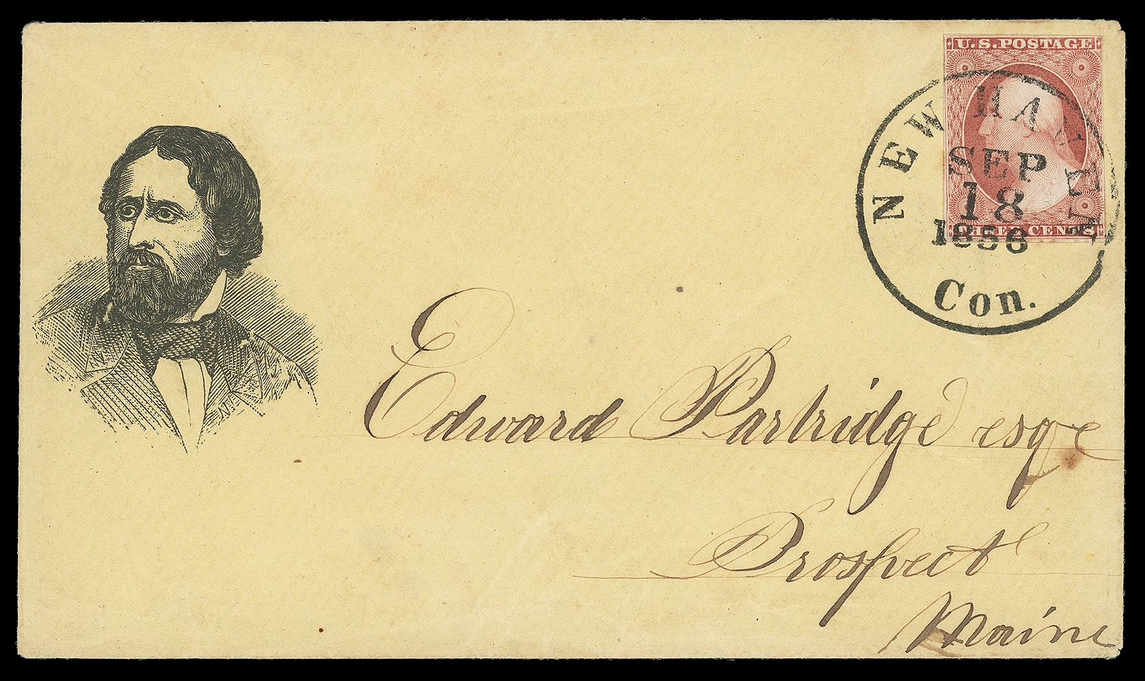 John Fremont. Portrait campaign design on light buff cover bearing 3¢ dull red (11A), beautiful shade, tied by bold "New Haven Con. Sep 18, 1856" cds to Prospect Me., an Extremely Fine gem use. Milgram No. JF-6; Estimate $300 -