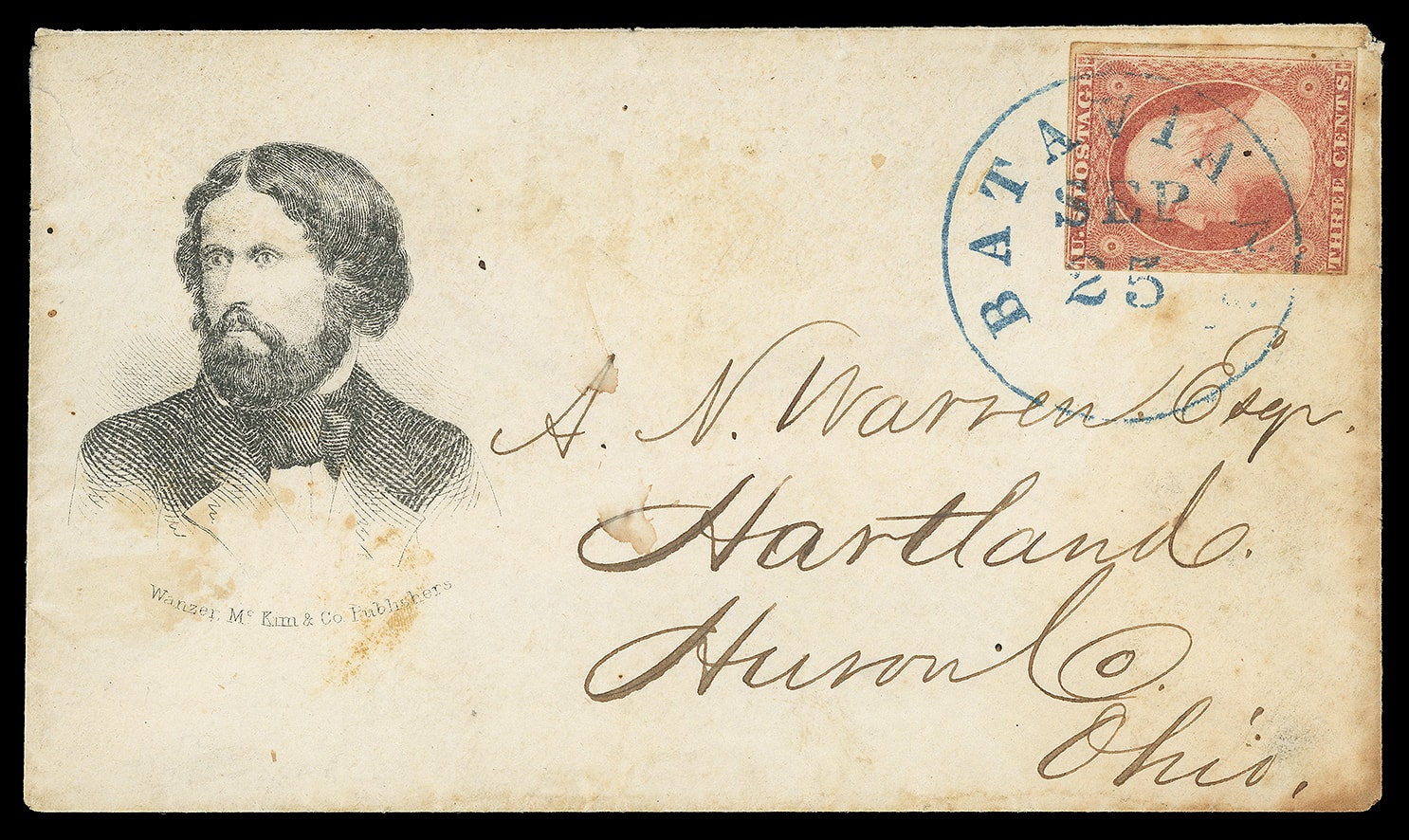 John Fremont. Portrait campaign design with "Warnzer, McKimm & Co. Publishers" imprint below, on cover bearing 3¢ dull red (11) tied by blue "Batavia N.Y. Sep 25" cds to Hartland Ohio; light toning, F.-V.F. Milgram No.