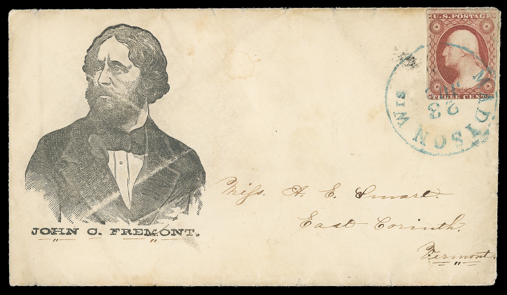 John Fremont. Large portrait campaign design with "John C. Fremont" caption below on cover bearing 3¢ dull red (11) tied by blue "Madison Wis. 23 Jan" cds to East Corinth Vt.; 3¢ small flaws, F.-V.F. Milgram No. JF-27;