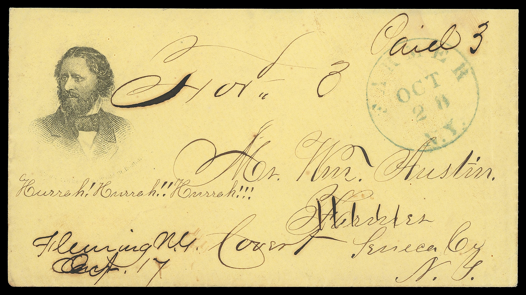 John Fremont. Portrait campaign design with "Shepard Clark & Co, 110 Washington St., Boston, Mass" imprint below along with additional ms. "Hurrah Hurrah Hurrah" slogan, on yellow cover with manuscript "Fleming, N.Y. Oct 17"