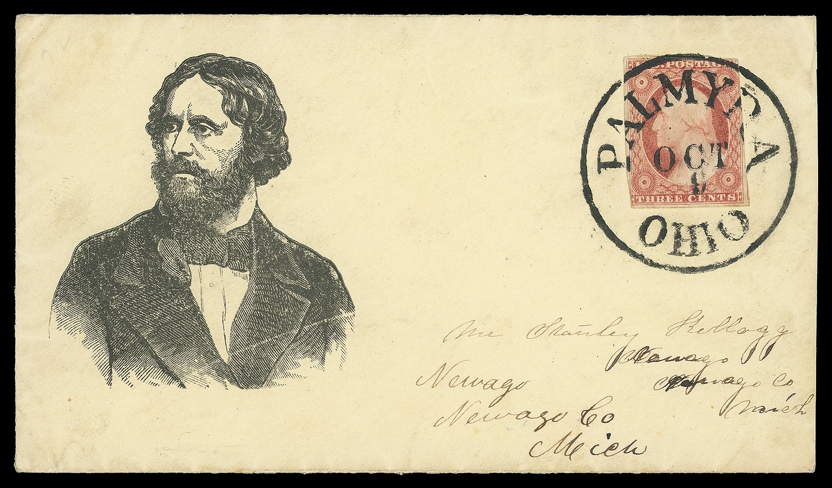 John Fremont. Large portrait campaign design on bright yellow cover bearing 3¢ dull red (11A), margins to in, tied by beautifully struck "Palmyra, Ohio, Oct 6" balloon cds to Newago Mich., address restated, a Superb