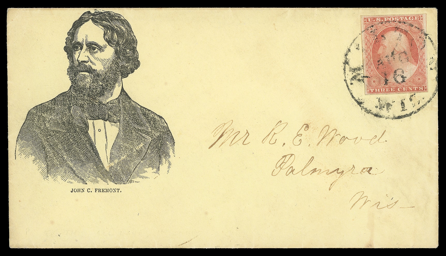 John Fremont. Large portrait campaign design with "John C. Fremont" caption below on light yellow cover bearing 3¢ dull red (11A), large margins, tied by "Wilton, Wisc. Aug 16" cds to Palymra Wisc., Very Fine. Milgram No.