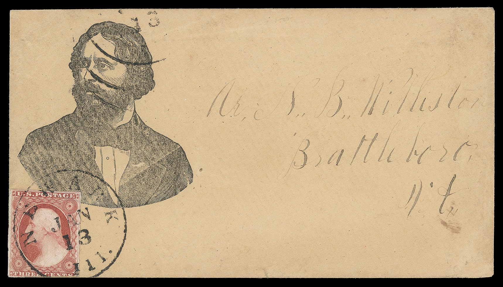 John Fremont. Large portrait campaign design on buff cover bearing 3¢ dull red (11), margins to in, rich color, tied by "Newark, Ill. Jun 13" cds to Brattleboro Vt., extra strikes of the town cds rim deface the portrait as