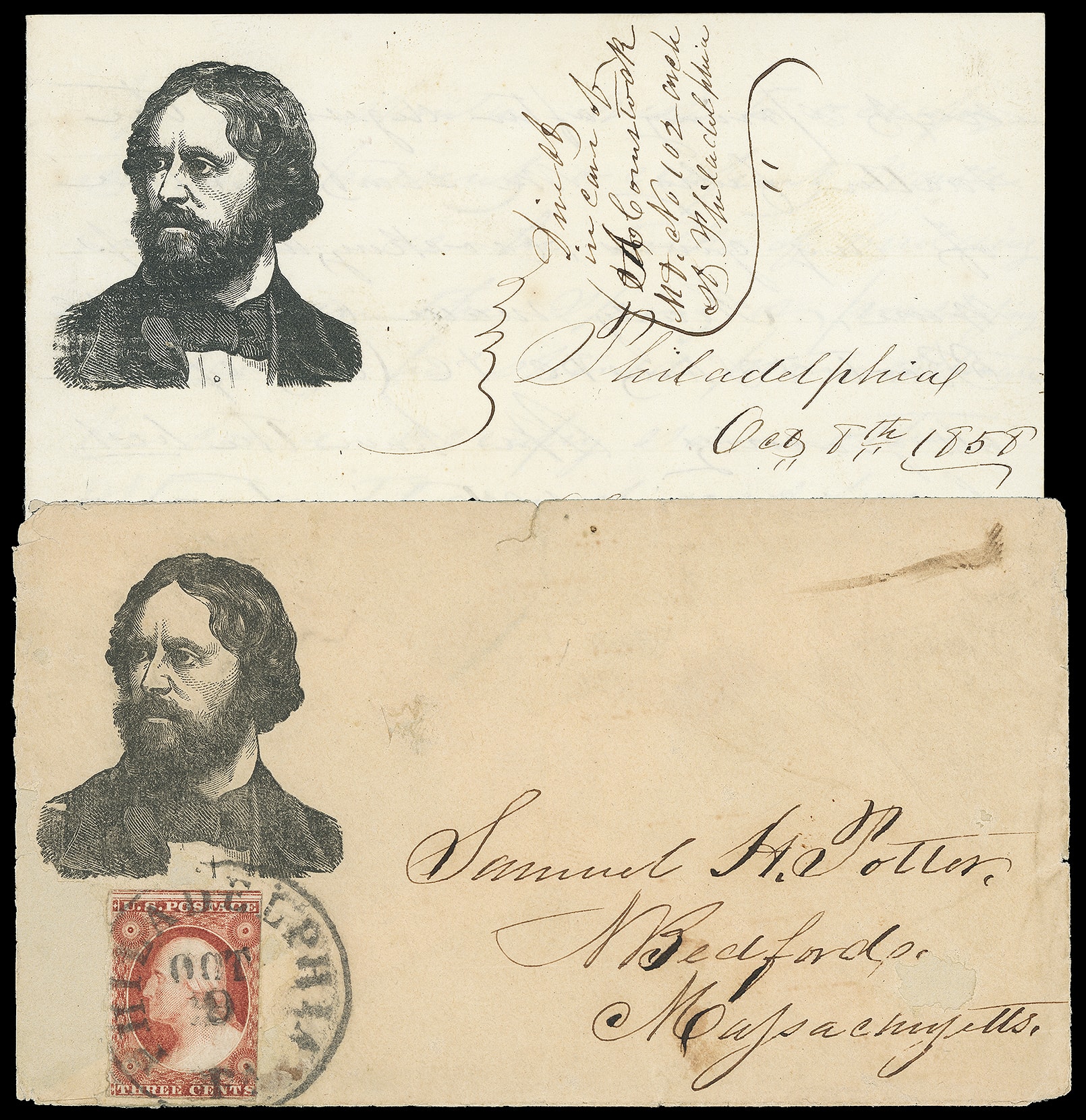datelined "Philadelphia, Oct. 8th 1858"; cover faulty with some paper loss, Fine appearance. Milgram No. JF-33; Estimate $150 - 200. (Image1)