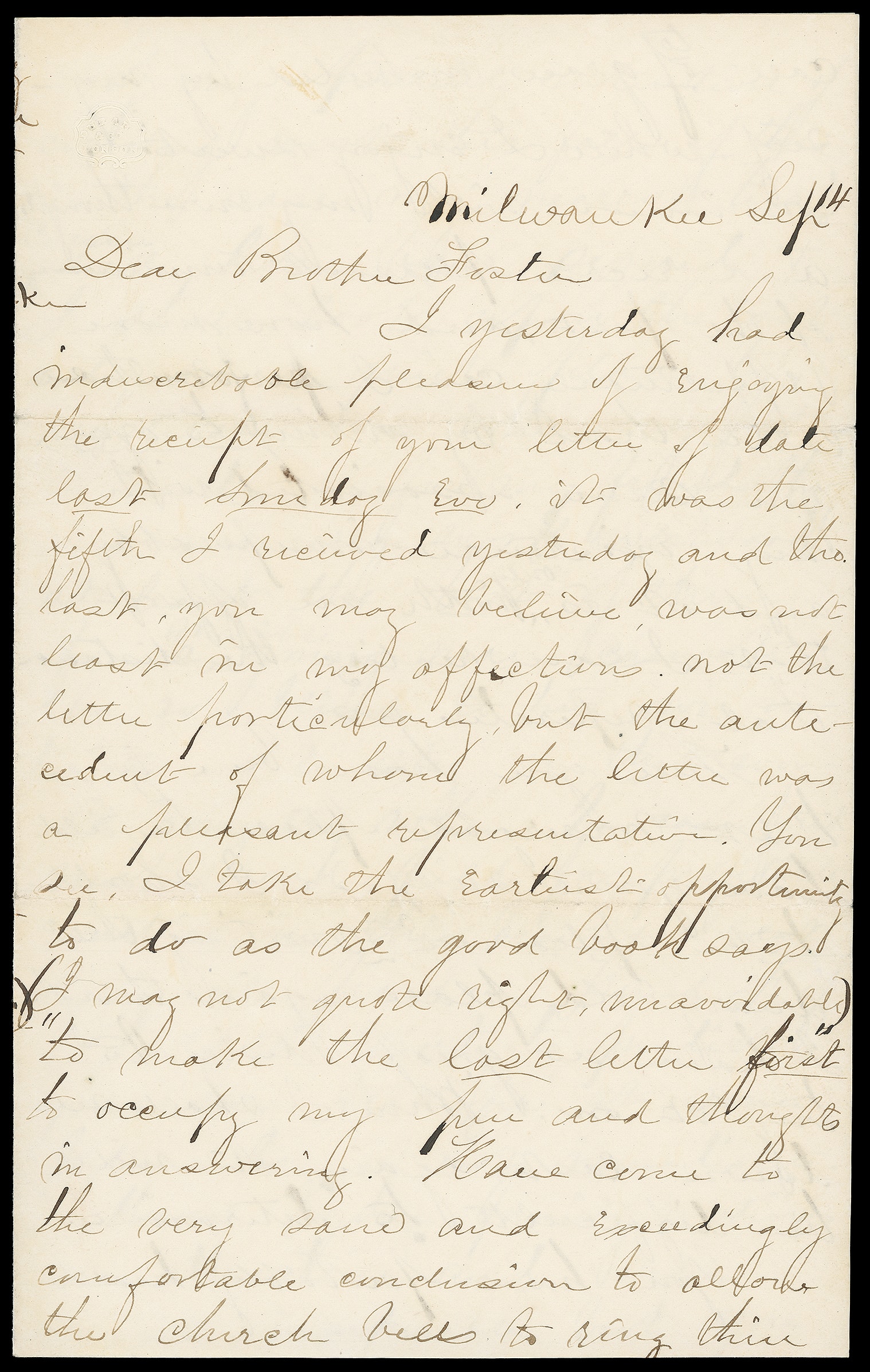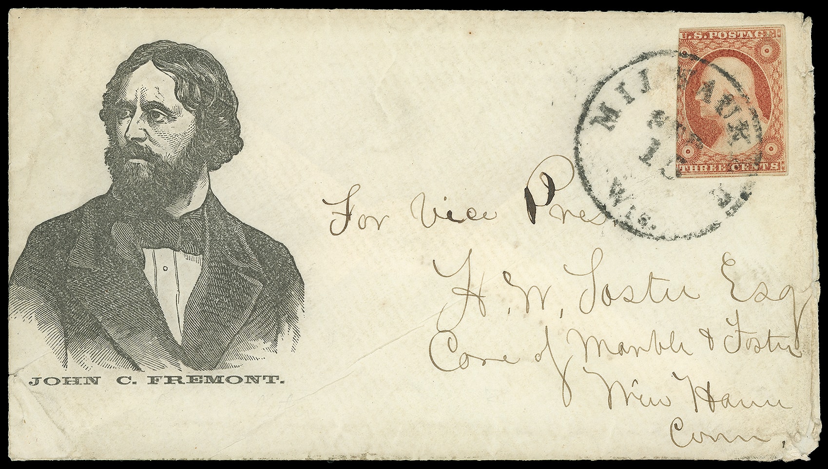 John Fremont. Large portrait campaign design with "John C. Fremont" caption below on cover bearing 3¢ dull red (11), small crease, tied by "Milwaukee Wis. Sep 15" cds to New Haven Ct, also includes original "Milwaukee Sep 14" letter with