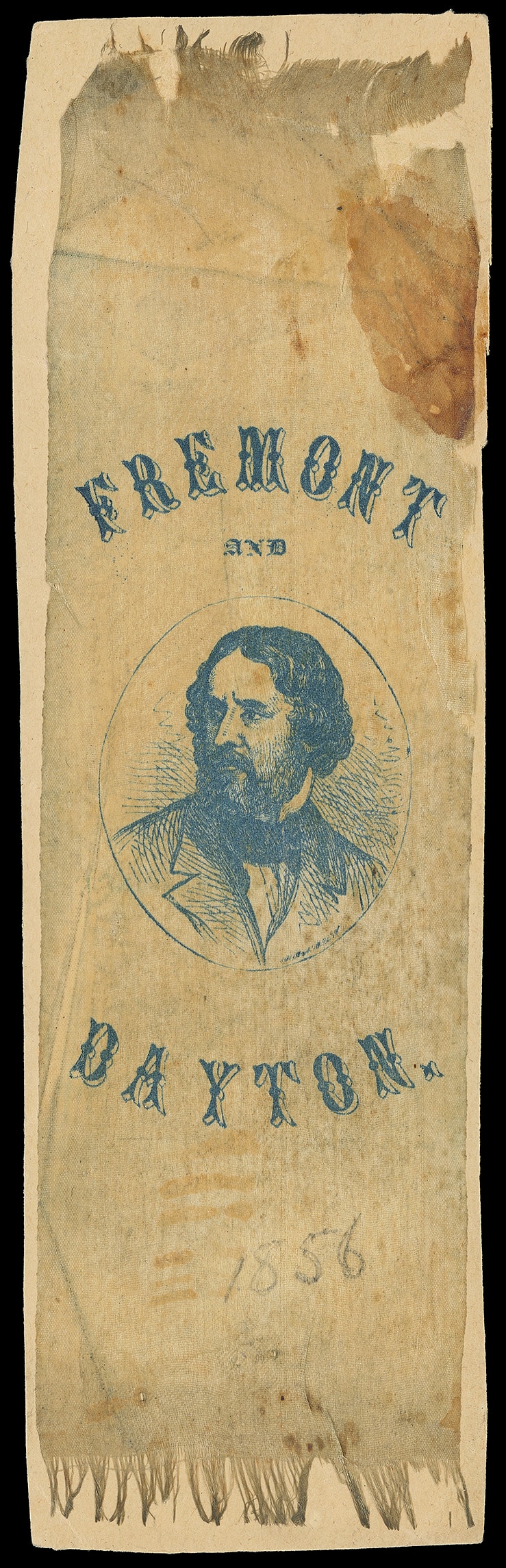 Americans…The camp was crowded to overflowing and I never saw an audience listen as attentively to a political speech in my life…"; and silk campaign ribbon showing Freemont in blue and names above "Freemont" above and "Dayton"