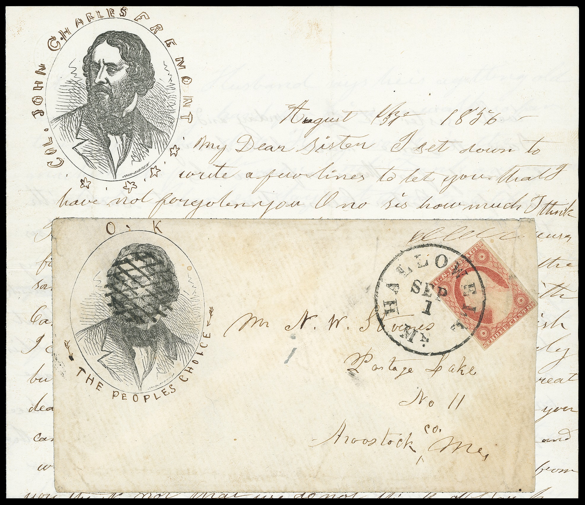 to Aroostock Me.,with matching portrait campaign design letterhead enclosure datelined "August the 31, 1856" and with additional manuscript "Col John Charles Freemont" caption around oval; wear and light soiling, reduced at right and