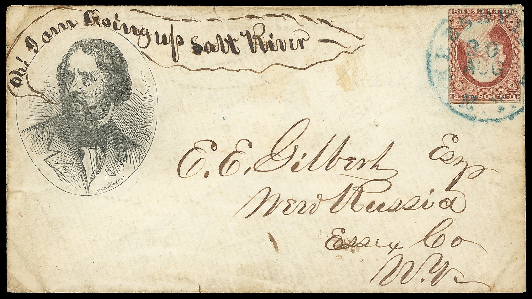 John Fremont. Portrait campaign design in oval with manuscript "Oh I am going up Salt River" embellishment, on cover bearing 3¢ dull red (11) tied by blue "Keeseville N.Y. 30 Oct" cds to New Russia N.Y.; light soiling and edge