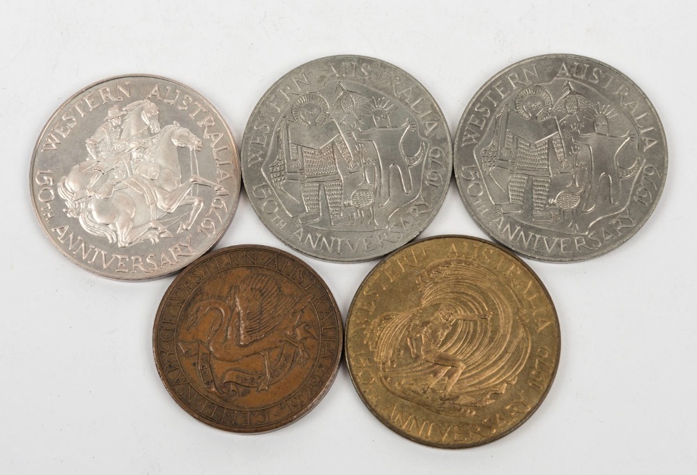 1929 Centenary of Western Australia copper medal (38mm); also 1979 150th Anniversary medals in silver, nickel (2) and bronze. (5 items).