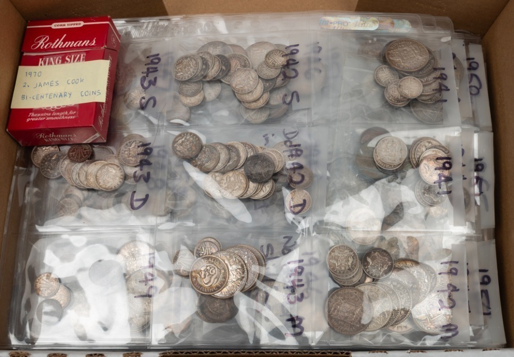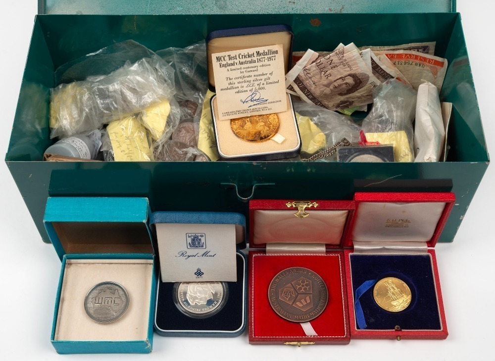 An accumulation of mainly pre--decimal Australian, G.B. and N.Z. coins, together with a range of crowns (or crown-like coins), a few medals, banknotes and odds. All contained in a cash box.