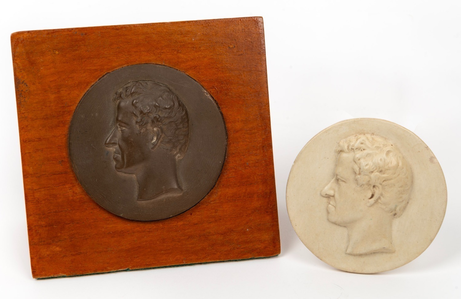 A bronze medallion of Charles La Trobe, after the image by Thomas Woolner; together with a plaster impression of the same medallion; both 75mm diameter. (2 items; the first mounted on a wooden stand).