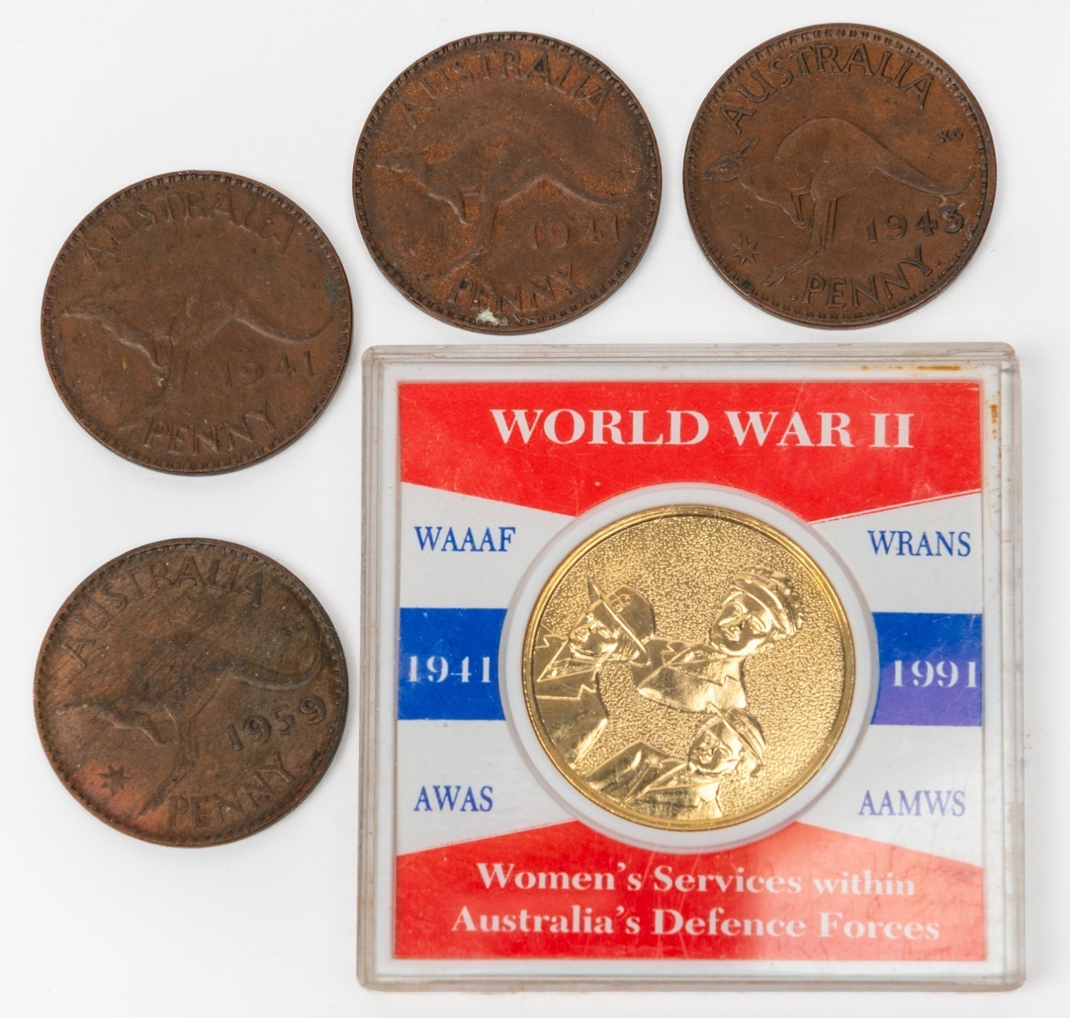 1941-91 Women's Services within Australia's Defence Forces gilt medallion in plastic case of issue; together with 1941 (2), 1943 and 1959 Pennies. (5 items).