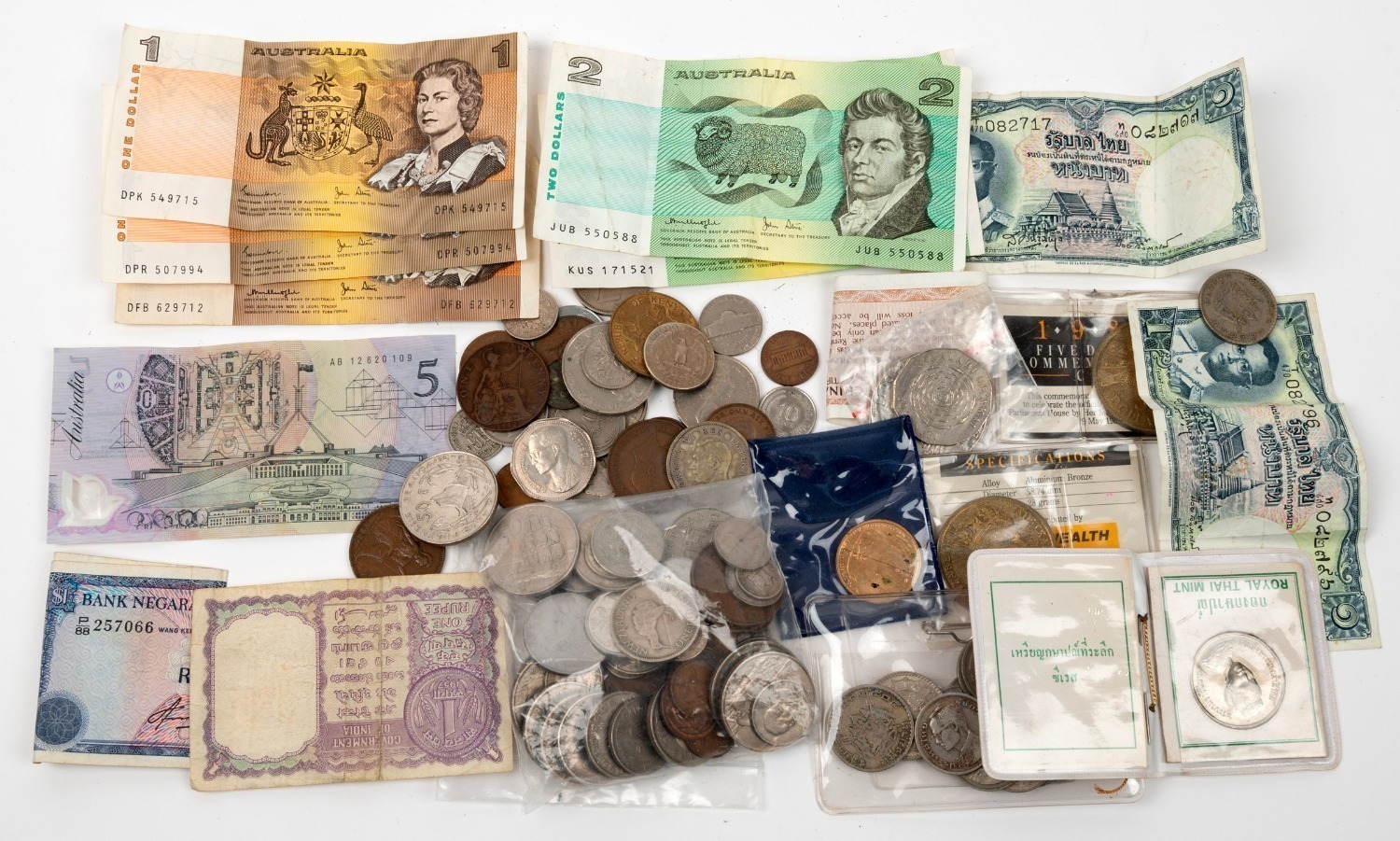 A small box containing an accumulation of coins and banknotes; a little Australian material noted.