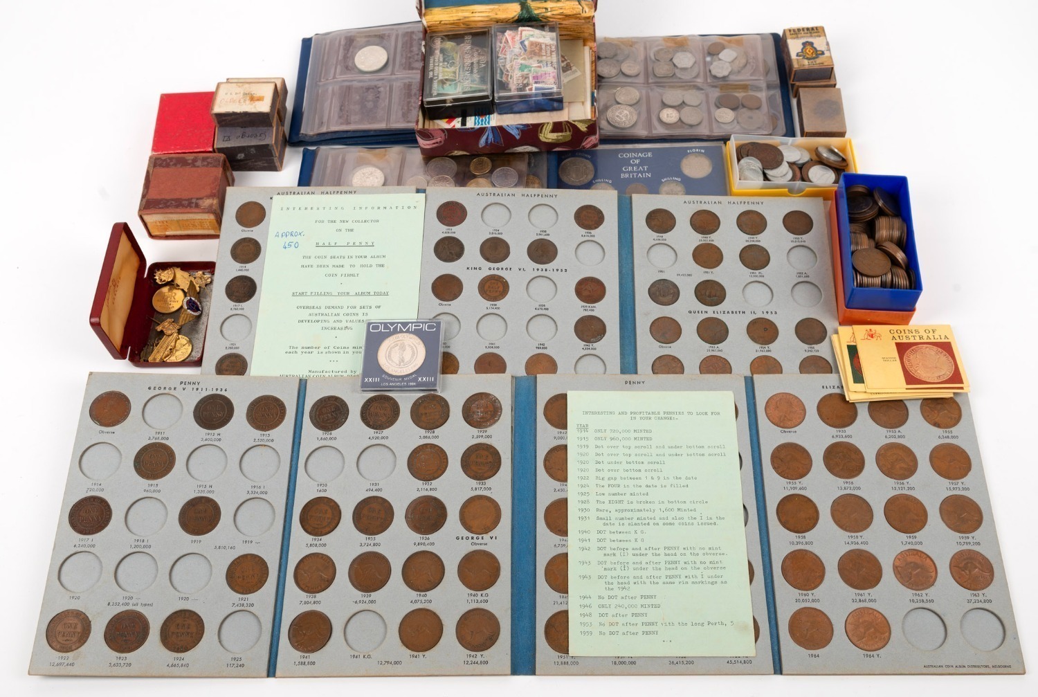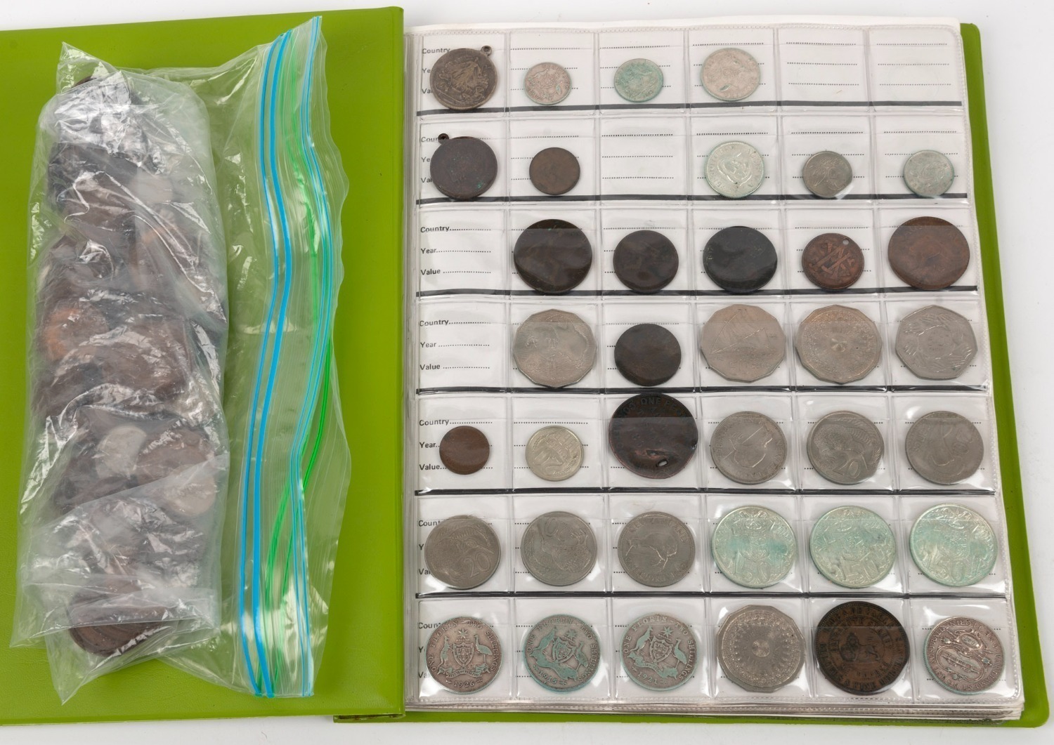 AN ACCUMULATION OF ASSORTED COINS, MEDALLIONS AND BADGES: Housed in a green album with a quantity loose. Of note: 1966 Australian 50 cents pieces, 1927 Australian Floren, decimal and pre-decimal Australian