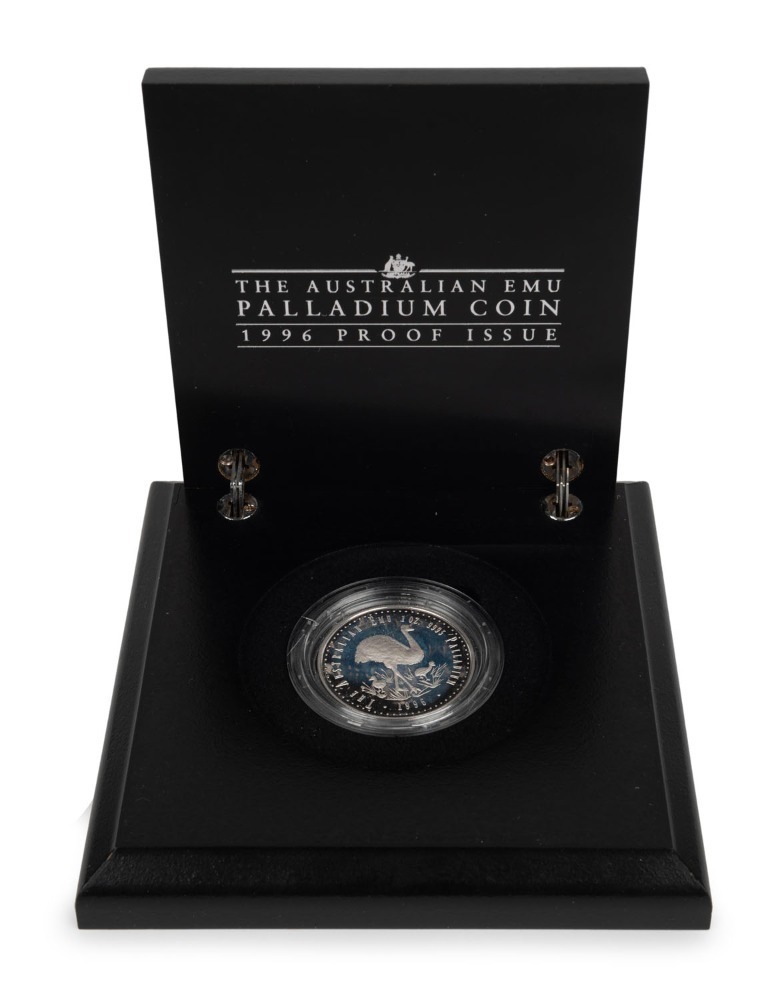 1996 $40 (1oz) Palladium Emu Proof in felt-lined case of issue. With Certificate of Authenticity No.0496 of only 2,500 produced.