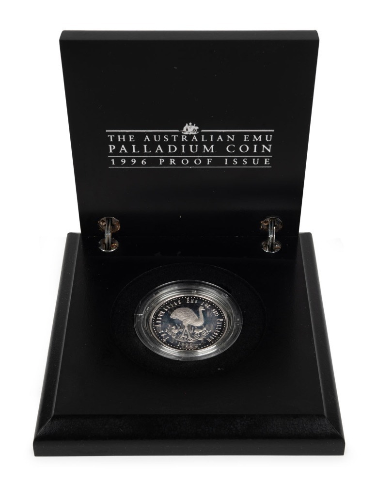 1996 $40 (1oz) Palladium Emu Proof in felt-lined case of issue. With Certificate of Authenticity No.0496 of only 2,500 produced.