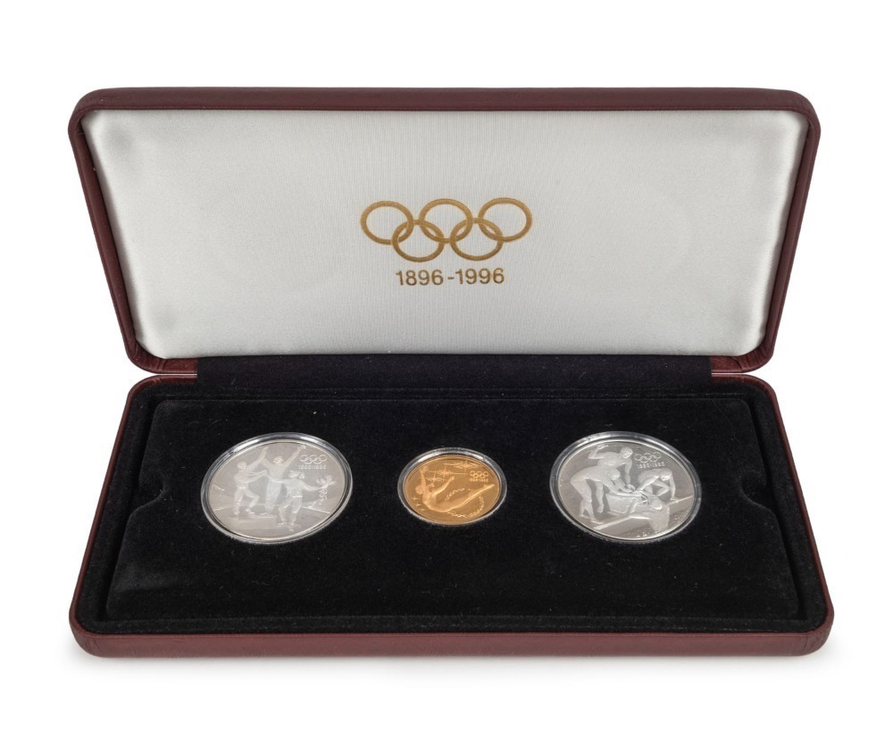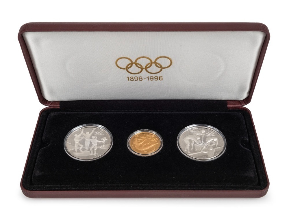 1896-1996 Olympic Centennial Coin Programme - Series II - Participation, Friendship & Fair Play. 1993 cased proof set of 3 comprising of gold $200 Gymnast, silver $20 The Relay Team and $20 The