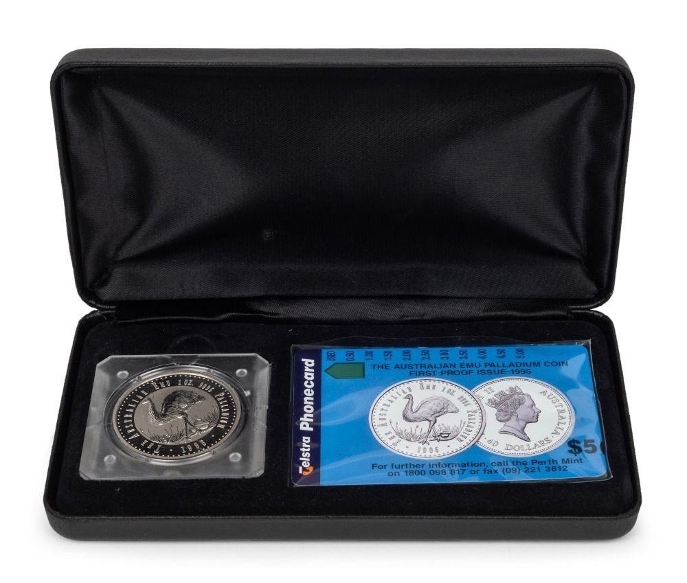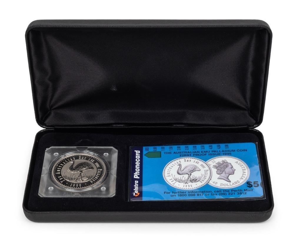 1996 $40 (1oz) Palladium Emu Proof in felt-lined case of issue with $5 Emu Palladium Phone Card.