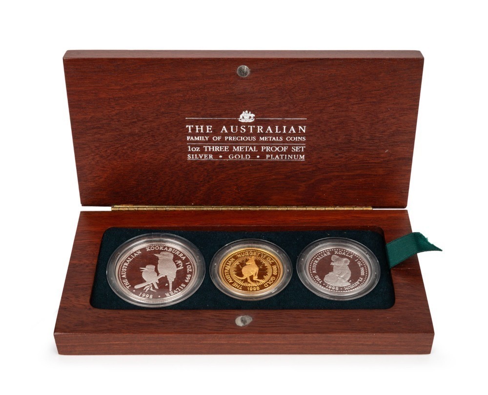 THE 1998 AUSTRALIAN FAMILY OF PRECIOUS METAL PROOF COINS: comprising of a $1 (1oz) Australian Kookaburra silver Proof, a $100 (1oz) pure gold Australian Nugget Proof, and a $100 (1oz) platinum Koala Proof, all